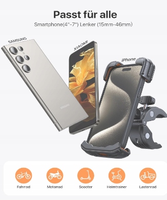 [Всесторонняя защита] На внутренней стороне зажимных рычагов велосипедного держателя мобильного телефона имеются волнистые силиконовые накладки, которые не только уменьшают вибрацию, но и защищают ваш телефон от царапин. Каркас этого держателя для телефона чрезвычайно прочный, что делает его вторым, очень толстым чехлом для вашего телефона. Даже если велосипед неожиданно упадет, телефон не упадет и останется целым.