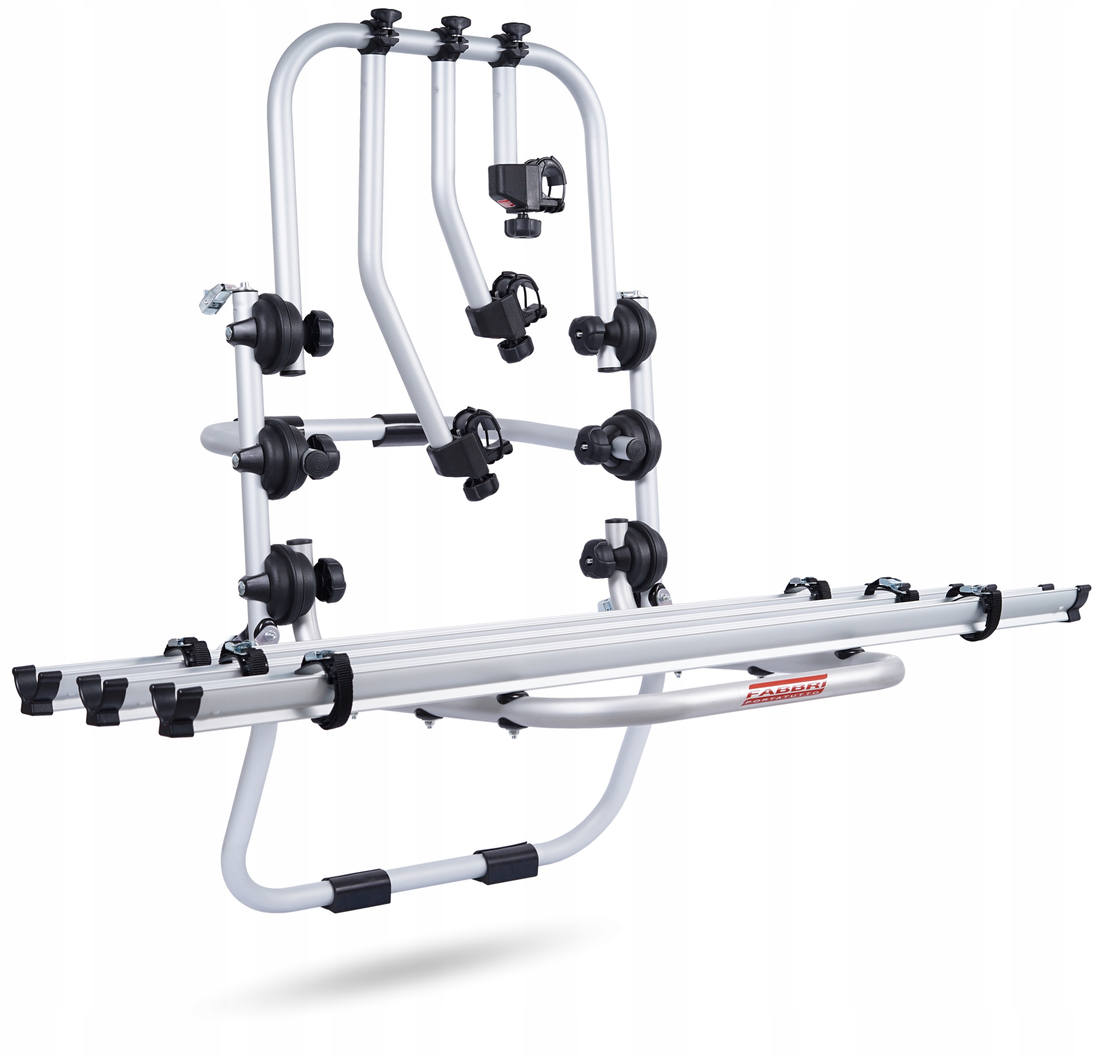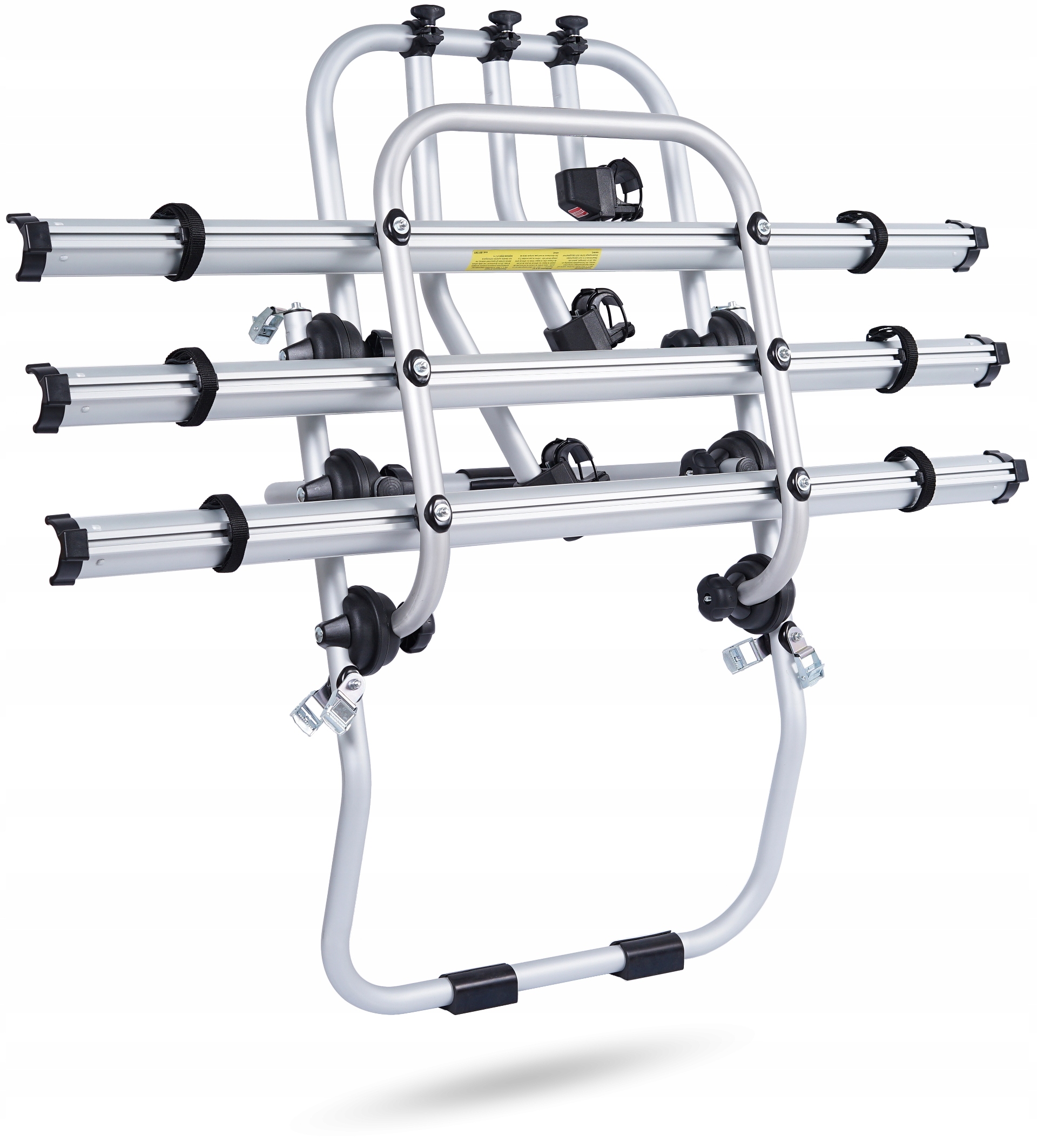 Складная, алюминиевая, итальянская ручка для перевозки 3-х велосипедов, крепится на задний люк багажника автомобиля с помощью 6 ремней. Используемые решения позволяют безопасно перевозить велосипеды: