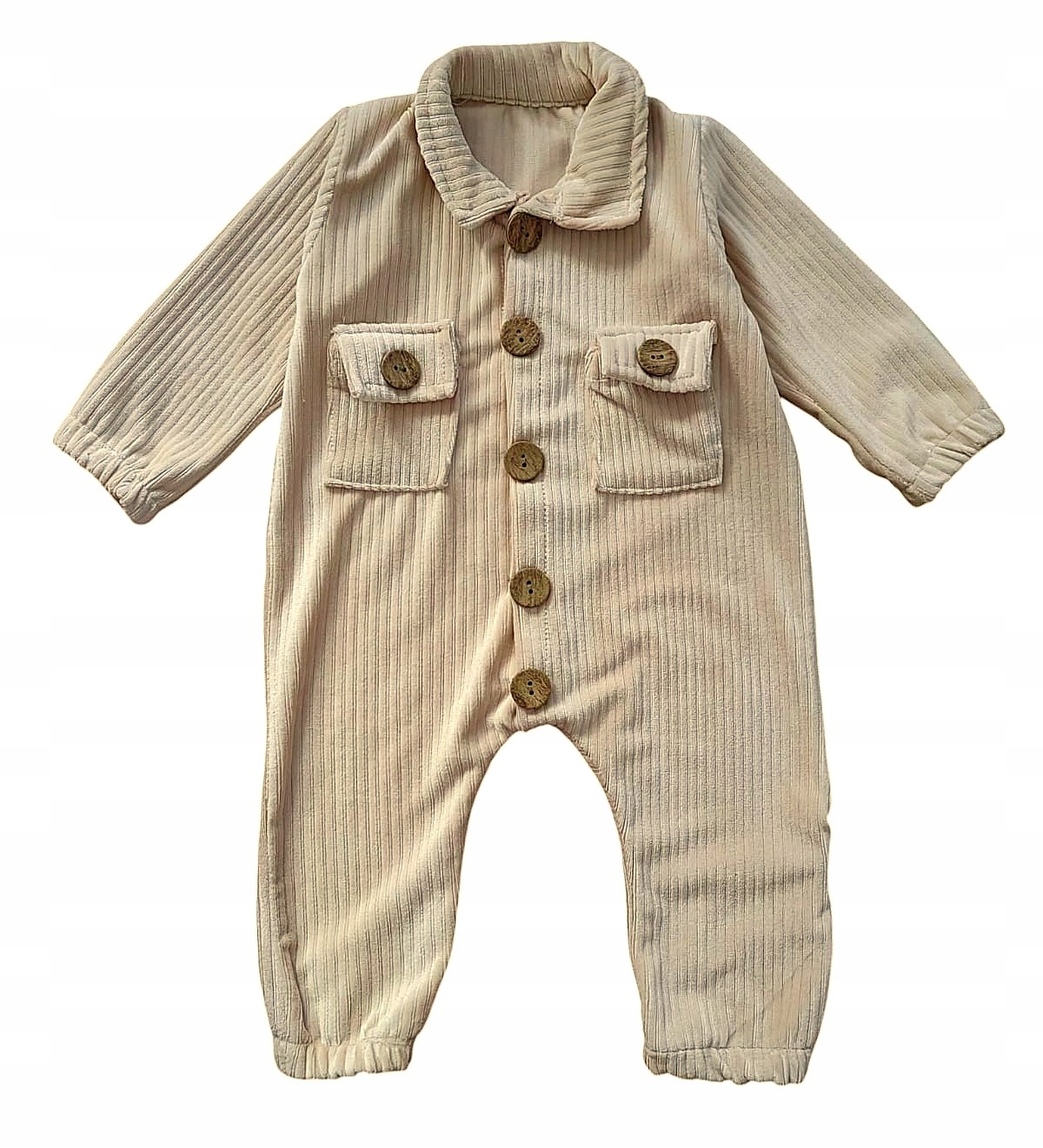 Мягкий велюровый детский комбинезон в модную полоску, застегивающийся спереди на деревянные пуговицы.