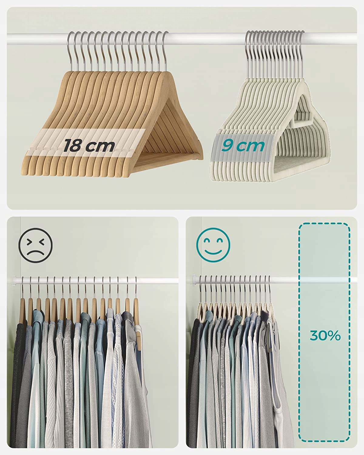 Велюровые вешалки тонкие и занимают мало места в шкафу или гардеробной. Это позволяет разместить больше одежды на одной штанге и эффективнее использовать имеющееся пространство.