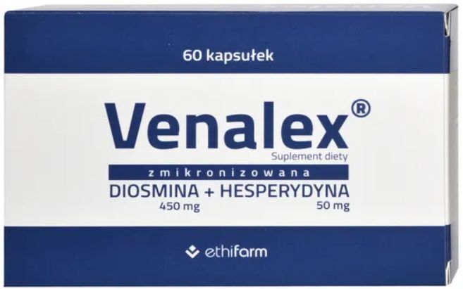 Веналекс 500 мг, пищевая добавка в форме капсул. Предназначен для взрослых. Препарат представляет собой комбинацию диосмина и гесперидина. Диосмин влияет на напряжение венозных стенок и правильный лимфодренаж. Гесперидин поддерживает антиоксидантный эффект.