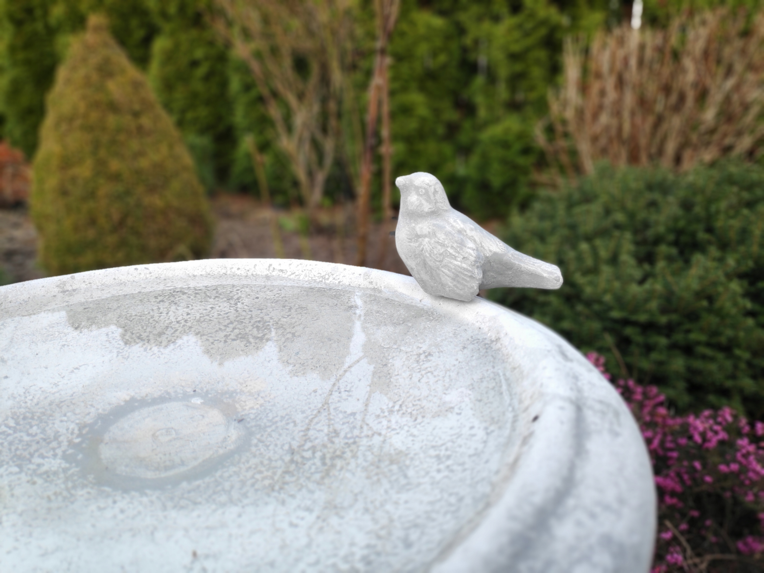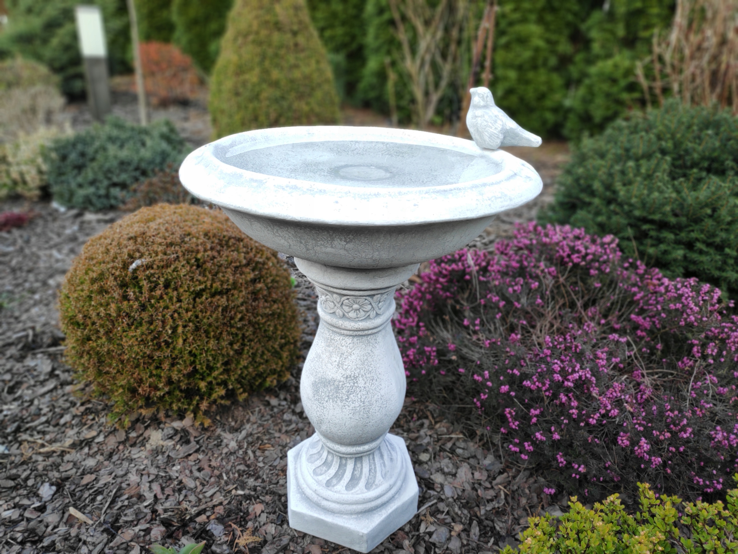 Эта купальня для птиц необычной высоты 55 см выглядит впечатляюще, но при этом пропорциональна окружающей обстановке. Его тарелка диаметром 38 см и глубиной 7 см обеспечивает комфортное пространство для купания и питья птиц. Прочное основание размером 20 х 20 см гарантирует устойчивость и безопасность этого красивого садового элемента.