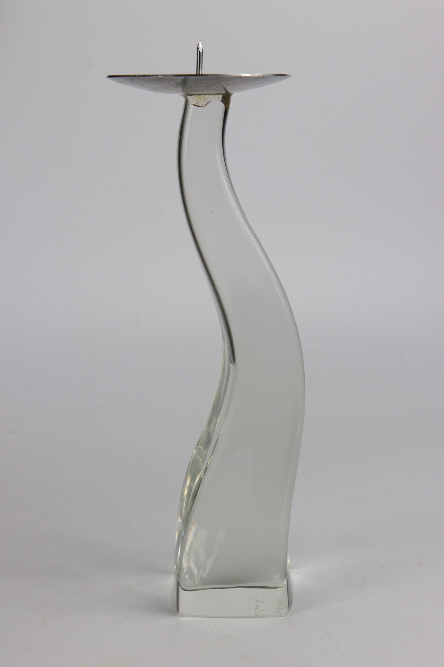 Подсвечник из муранского венецианского хрусталя Marcello Furlan. Подсвечник подписан выгравированным именем и датой Марчелло Фурлана 94. Подсвечник очень интересной сигмоидальной формы, массивное стекло, увенчанное никелированной розеткой для крепления свечи.