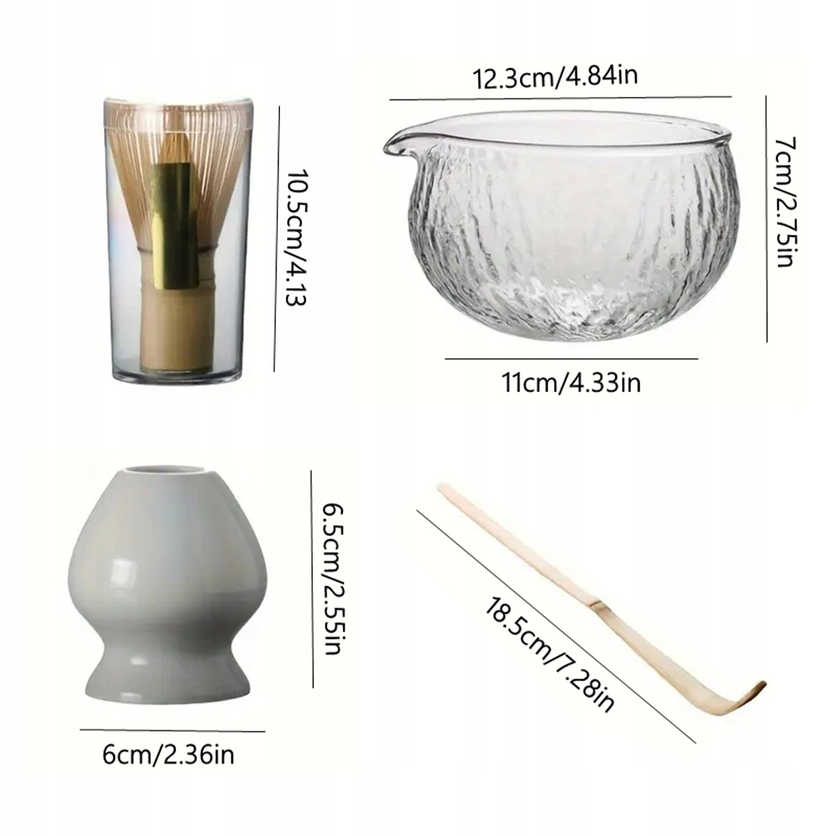- Размер изделия: стеклянная чаша 12,3*7*11 см, Пиала для чая 6,5*6 см, чайная ложка 18,5 см, пиала для чая 10,5 см.