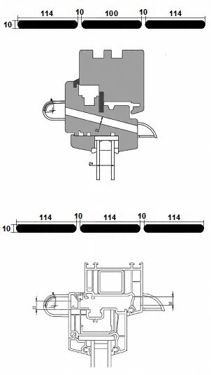 На втором чертеже показан монтаж воздухоотводчика в окне ПВХ. Также показано поперечное сечение сквозных отверстий, а также его диаметр, длина и расстояние между отверстиями.