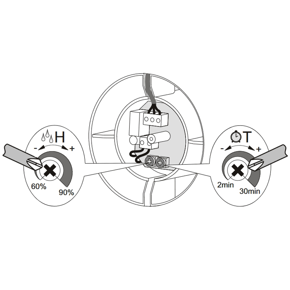 Функция Higro-Timera: H2> - Функция времени переключателя времени позволяет отложить выключение вентилятора (например, с помощью разъема освещения) в диапазоне, установленном в задней части устройства (диапазон жидкости 2-30 минут). Комната превышает порог в диапазоне, установленном в задней части устройства (диапазон жидкости 60-90%). После того, как влажность упала ниже порога датчика, вентилятор все равно будет работать в соответствии с настройкой переключения времени.