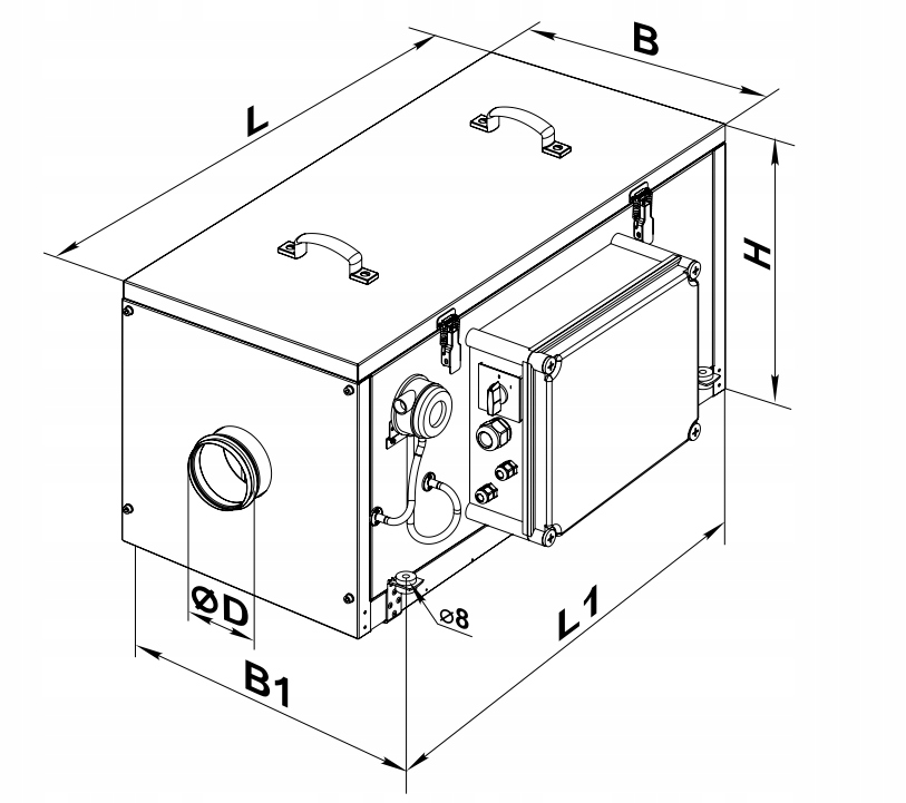 2 варианты возможны: без контроля и системы управления и автоматизации (с еженедельным программистом рабочего времени, производительности вентилятора и мощностью нагревателя). Система управления позволяет регулировать расходы на воздух, установить температуру подачи воздуха, контролировать степень загрязнения фильтра и программировать еженедельный рабочий цикл устройства. Кроме того, система автоматизации обеспечивает защиту от перегрева нагревателя. Для связи с устройством используется панель управления, которая должна быть установлена в комнате, в которой подается воздух - панель содержит датчик температуры.