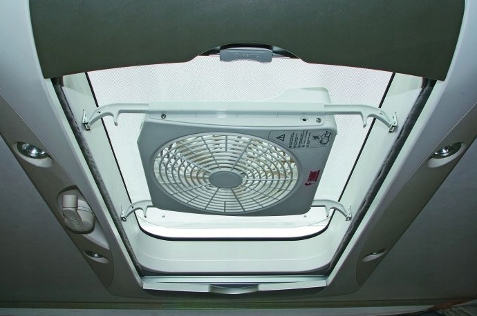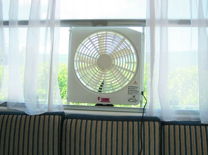Питание 12 В от прицепной, кемперной установки или самостоятельно от аккумулятора или батареек. Вентилятор диаметром 24 см имеет две скорости вращения.