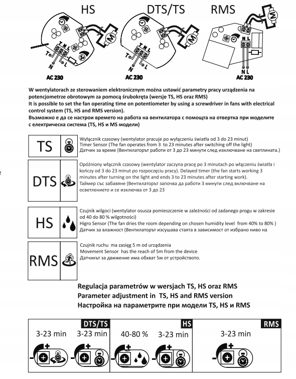 - время задержки отключения(3-23 мин). Вентилятор работает от 3 до 23 минут после его выключения вручную, например, с помощью выключателя, встроенного в светильник.