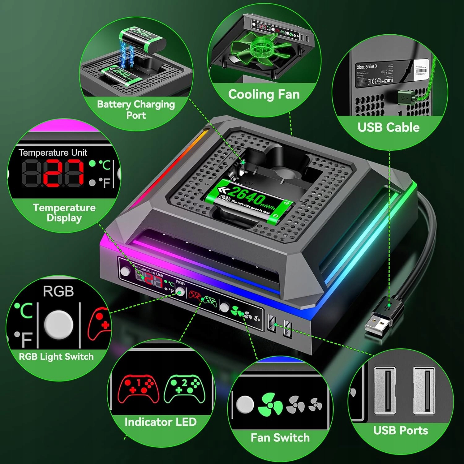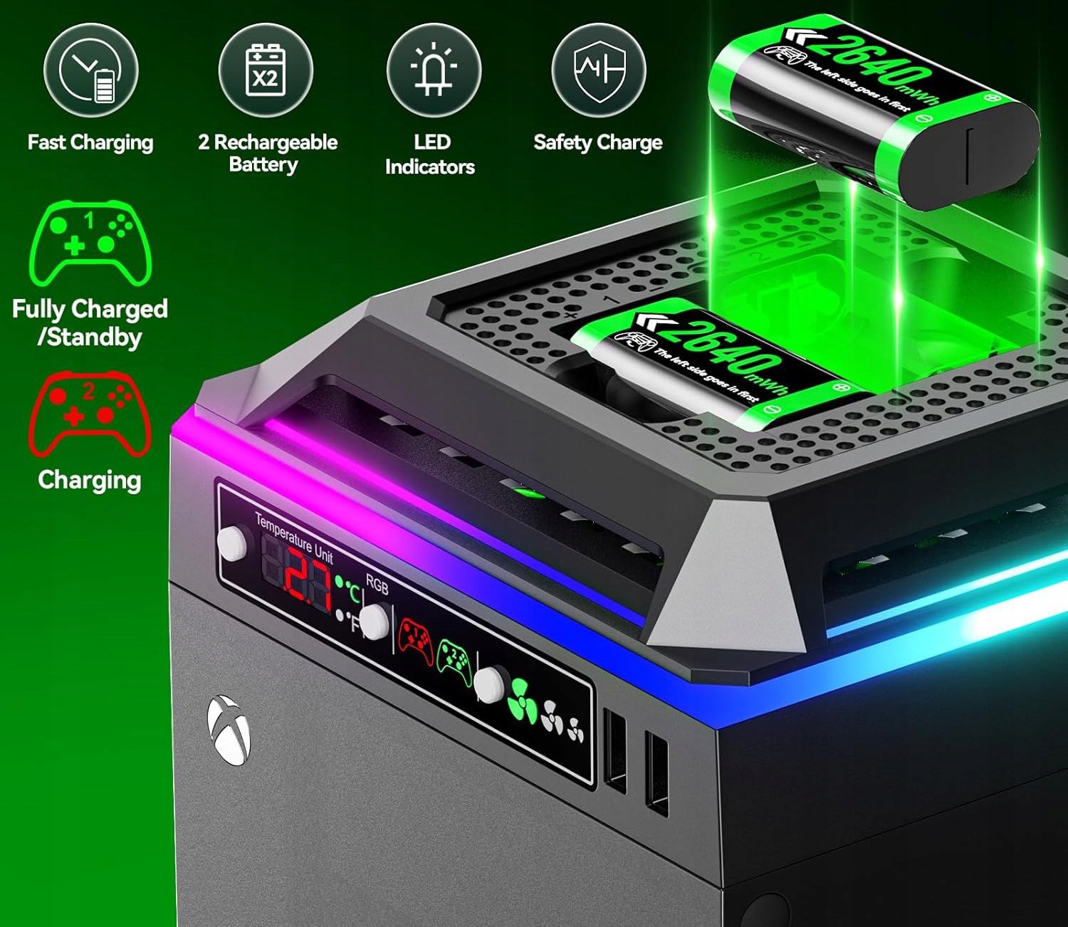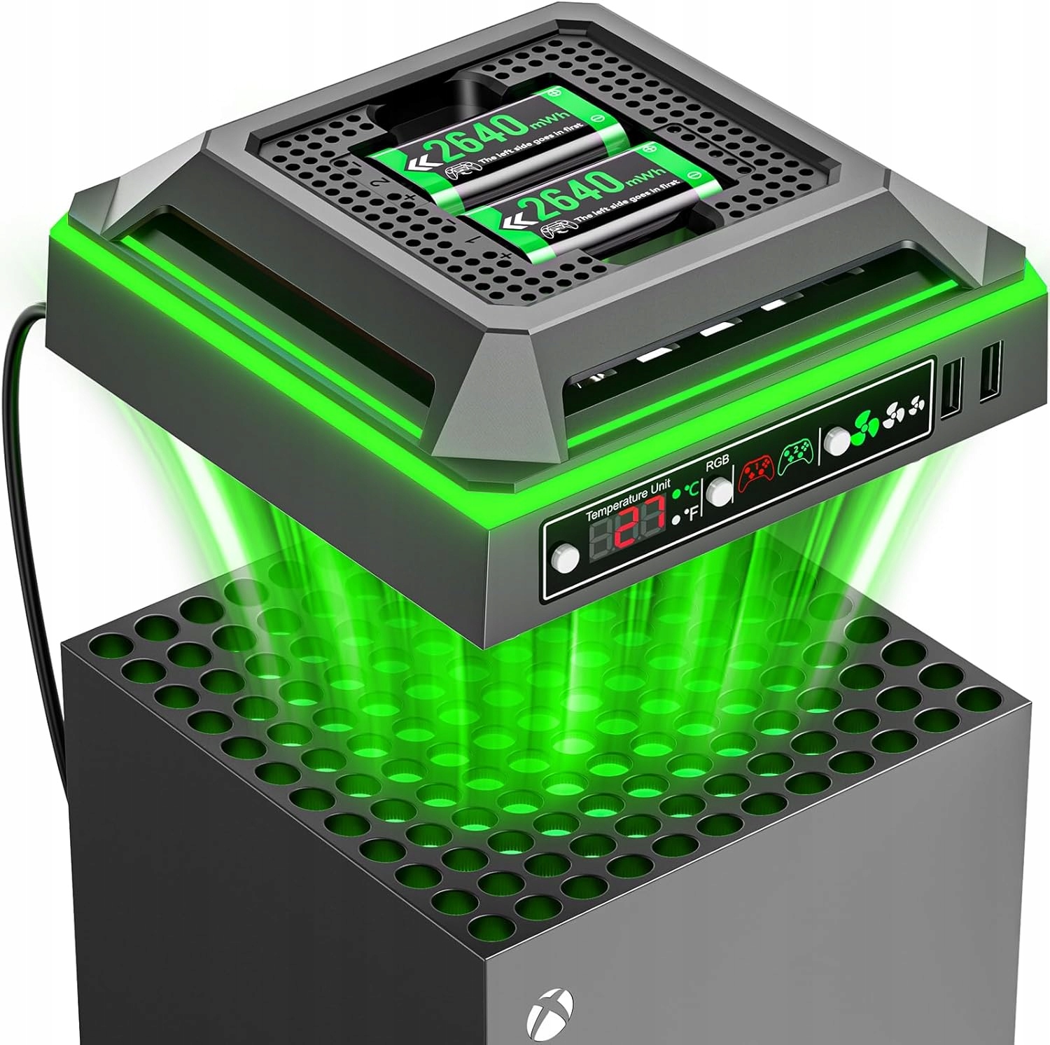 Вентилятор Xbox Series X с RGB-охлаждением, зарядная станция с 2 аккумуляторами емкостью 2640 мВтч, 2 порта USB