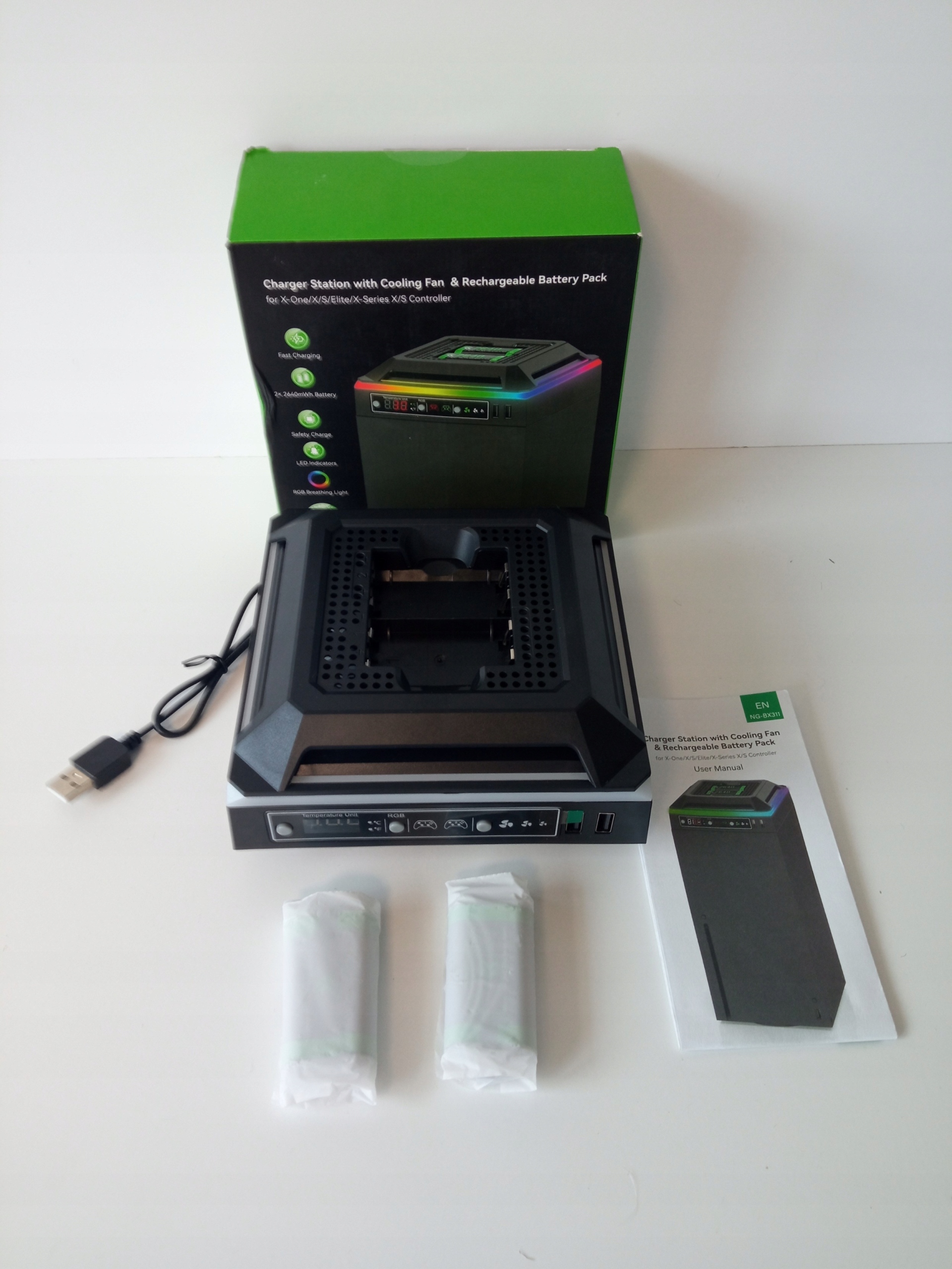 - Package contents: Cooling fan, 2 batteries, charging станция