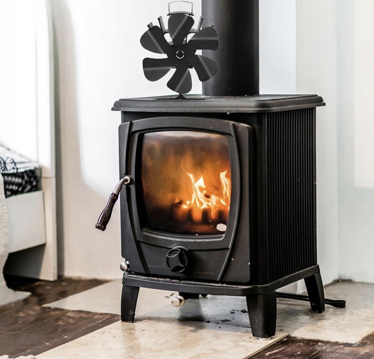 Благодаря 6-лопастному вентилятору, работающему за счет тепла камина, тепловой комфорт в помещении повышается быстрее. Когда температура в камине ниже, вентилятор работает на полную мощность, что ускоряет распространение тепла по помещению.
