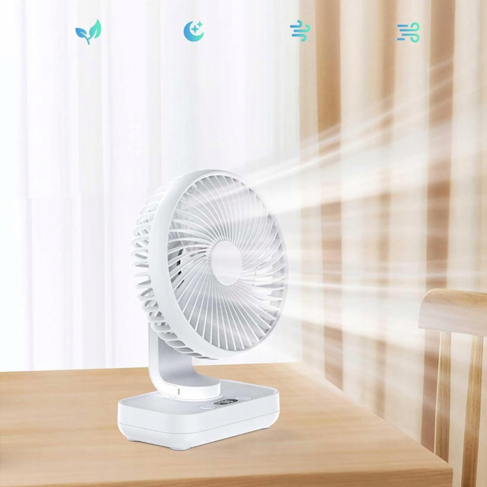 Вентилятор таблицы может действовать как мини -портативный кондиционер воздуха. Он был разработан с автоматическим горизонтальным оборотом с 72 градусами и вертикальной головкой, наклоненной 72 градусов, чтобы обеспечить оптимальную циркуляцию воздуха без прямого потока воздуха. Это эффективно охлаждает и обновляет комнату и обеспечивает приятный простуду.