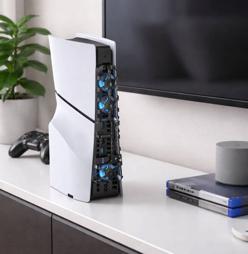 Новый внешний вентилятор, разработанный специально для PlayStation 5 Slim (версия с Blu-ray и цифровым приводом). Он помогает отводить тепло от задней части консоли, что помогает поддерживать более низкую температуру во время длительных игровых сессий и продлевает срок службы устройства.