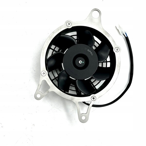 Вентилятор SPAL установлен на переходной пластине из нержавеющей стали толщиной 3 мм, вырезанной лазером (304), повторяющей те же крепления, что и оригинальный вентилятор.