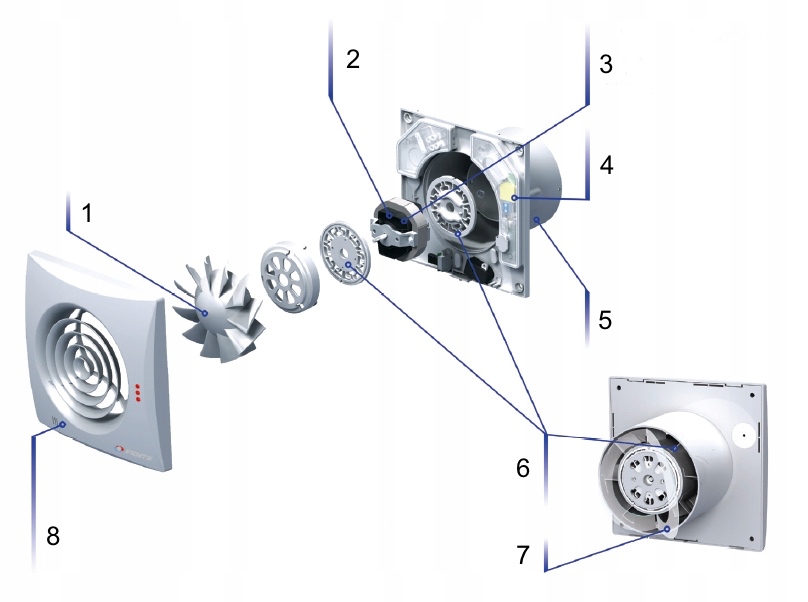 Корпус и крыльчатка изготовлены из высококачественного и прочного пластика, устойчивого к УФ-излучению. Специально разработанный аэродинамический профиль обеспечивает высокую эффективность использования воздуха и низкий уровень шума. Компактный дизайн позволяет устанавливать его на стенах и потолках. Малый размер патрубка для установки в вентиляционную шахту или подключения к круглому вентиляционному каналу. Вентилятор оснащен специально разработанным обратным клапаном для предотвращения обратной тяги и потерь тепла из помещения, пока вентилятор находится в режиме ожидания. Патрубок (разъем) вентилятора имеет специально разработанные воздушные «направители» для уменьшения турбулентности воздуха, увеличения давления воздуха и снижения уровня шума. Высокая степень защиты IP 45 обеспечивает идеальное решение для вентиляции ванной комнаты. Электронные компоненты защищены герметичными крышками с резиновыми прокладками.