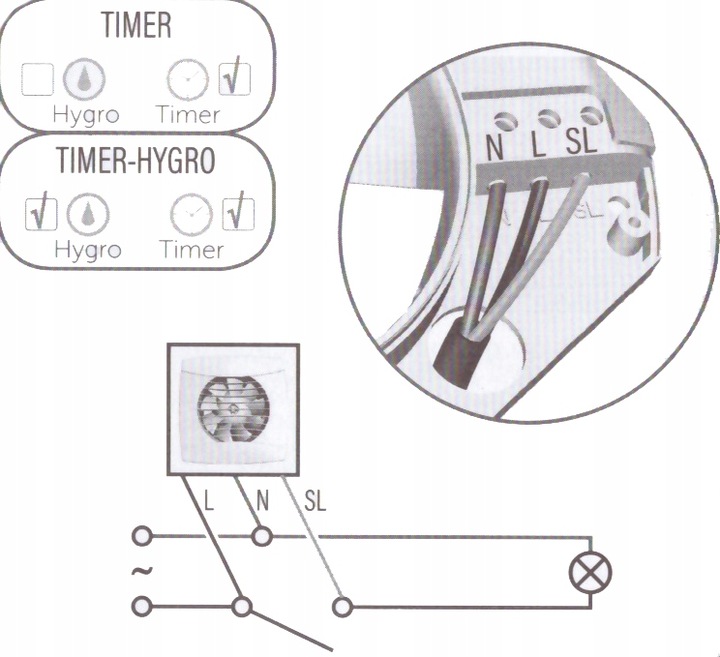 Вентилятор может быть подключен к 2 кабелям (L и N), чтобы он был работать и соответствовать всем другим функциям, кроме таймера (задержка времени).