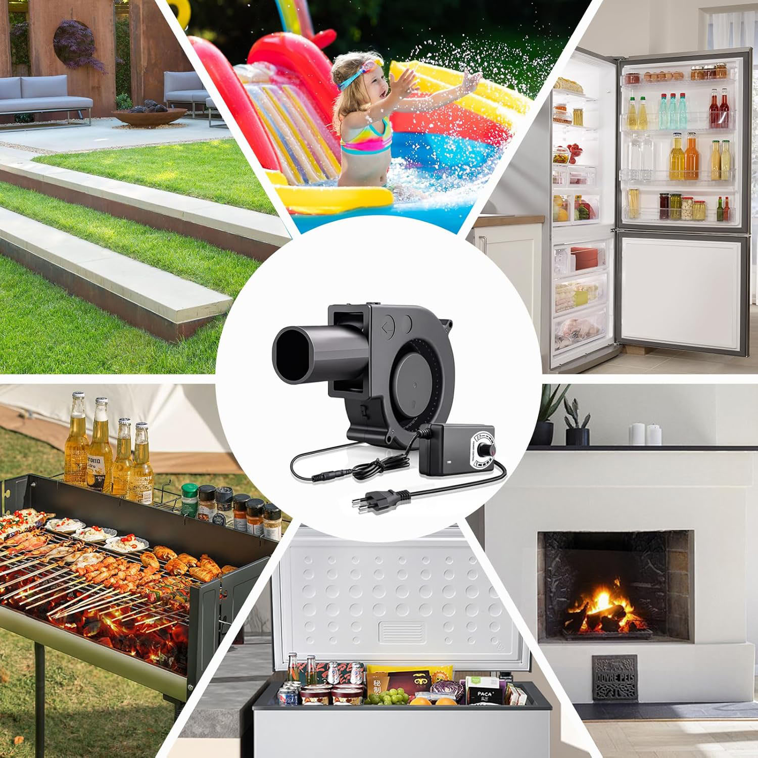 ta zasilana prądem zmiennym dmuchawa o zmiennej prędkości jest łatwa do przenoszenia; Компактный размер занимает меньше места. Идеально подходит для внутренних каминов или деревянных печи, а также для внешних дымоходов, дымоходов для древесного угля, курильщиков и надувных украшений во внутреннем дворике.