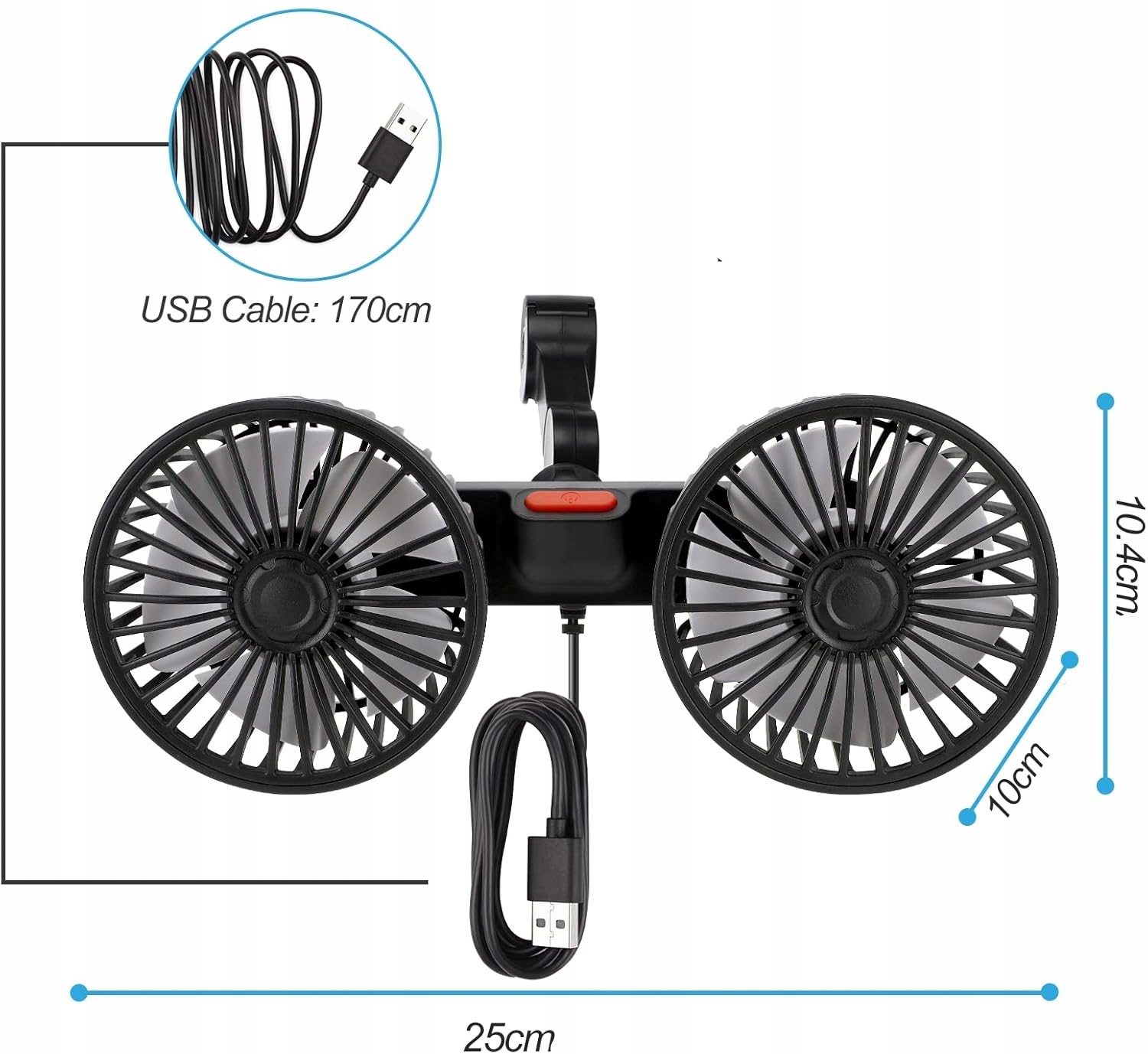 Специальные 2 -головы вентилятора автомобиля - вентилятор воздушного охлаждения предназначен 2 вращающимися головками, каждая из которых может быть полностью повернут на 90 °, основание вентилятора также вращается, голова вращается на 270 °, а зажим, вращающийся на 360 °, может обеспечить прохладный ветер вокруг каждого места автомобиля и сразу охлаждать пассажиров на заднем сиденье и животных на заднем сиденье. Просто настройте себя.