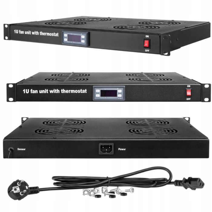Панель из четырех вентиляторов в 19-дюймовом RACK-корпусе высотой 1U с термостатом. Усиливает циркуляцию воздуха между активными теплогенерирующими устройствами внутри шкафов RACK, защищая их от перегрева.