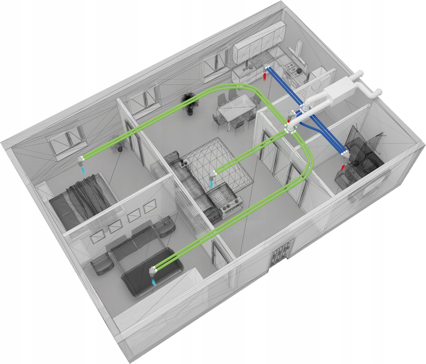 Специальная система соединений позволяет легко и быстро установить установку во время строительных или ремонтных работ без необходимости использования дополнительных инструментов. Небольшие размеры воздуховодов позволяют спрятать их в слое утепления потолка, в подвесном потолке или конструкции стены. Использование гибких воздуховодов и универсальных соединительно-монтажных элементов делают монтаж системы интуитивно понятным и простым.