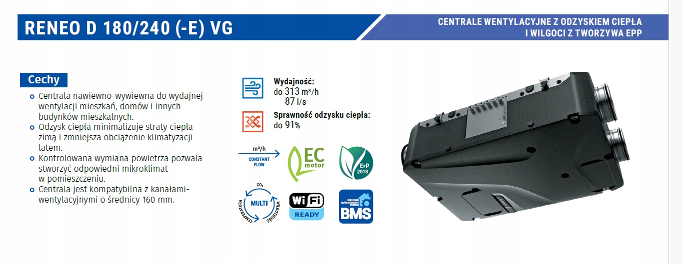 Приточно-вытяжная установка Reneo D 180-E VG / Reneo D 240-E VG – это современное устройство, предназначенное для эффективной вентиляции квартир, домов и других жилых помещений. Благодаря усовершенствованной системе рекуперации тепла минимизируются потери энергии зимой и снижается нагрузка на кондиционирование летом.