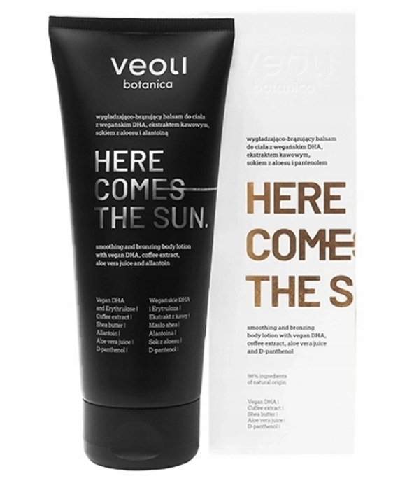 Здесь наступает солнце h1> сглаживание и коричневый лосьон для тела с веганским DHA, кофе -экстракт, сок алоэ и herethenol Вот и солнце h1>