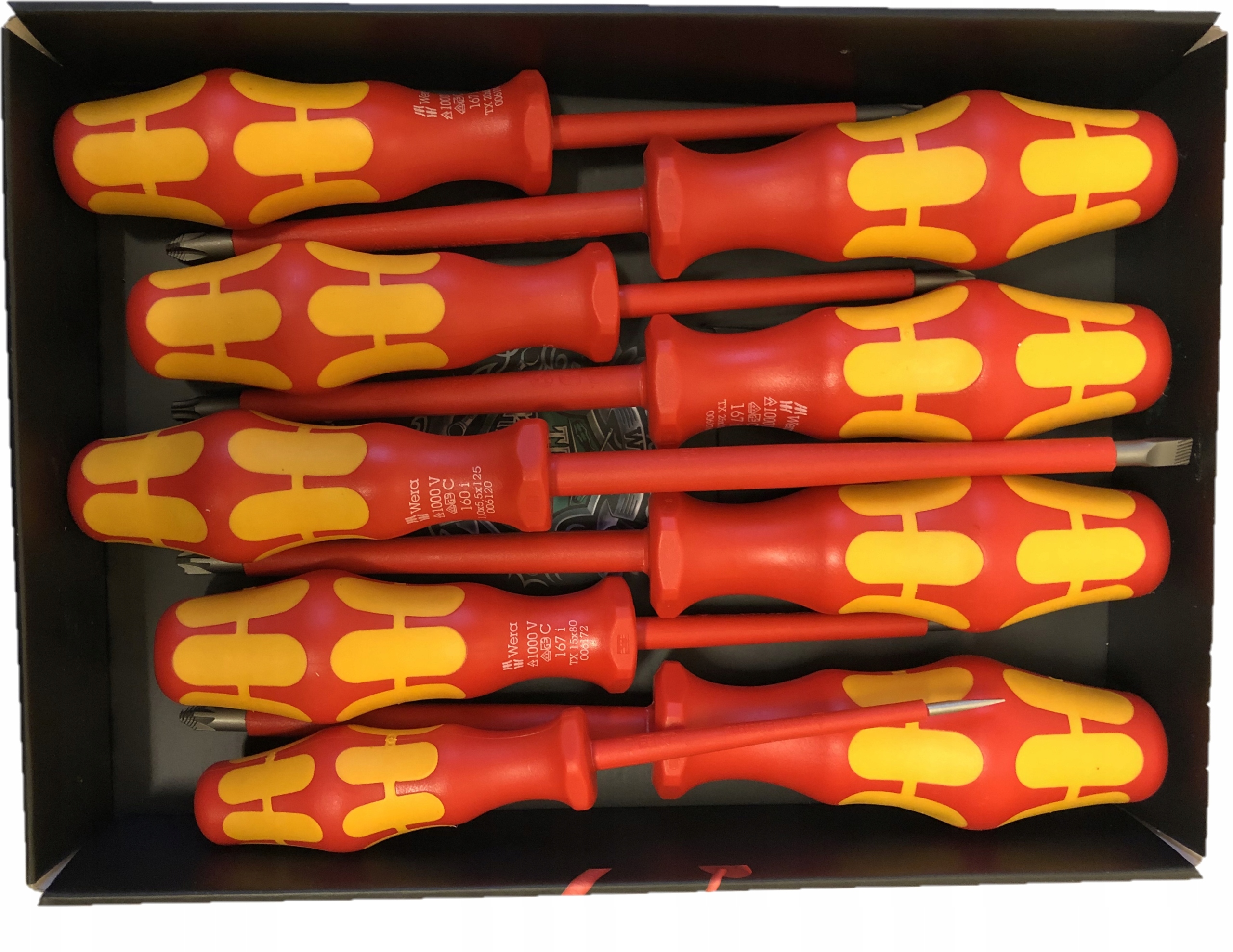 Изолированные отвертки VDE с 9 частями, набор с высокой изготовлением, с безопасным, и безопасным, и сейф-обработкой. Индивидуально контролируемая изоляция путем погружения в водяную баню при напряжении 10 000 В гарантирует рабочую безопасность 1000 В. 6-киночный воротник, предотвращающий выезд из рабочего места.