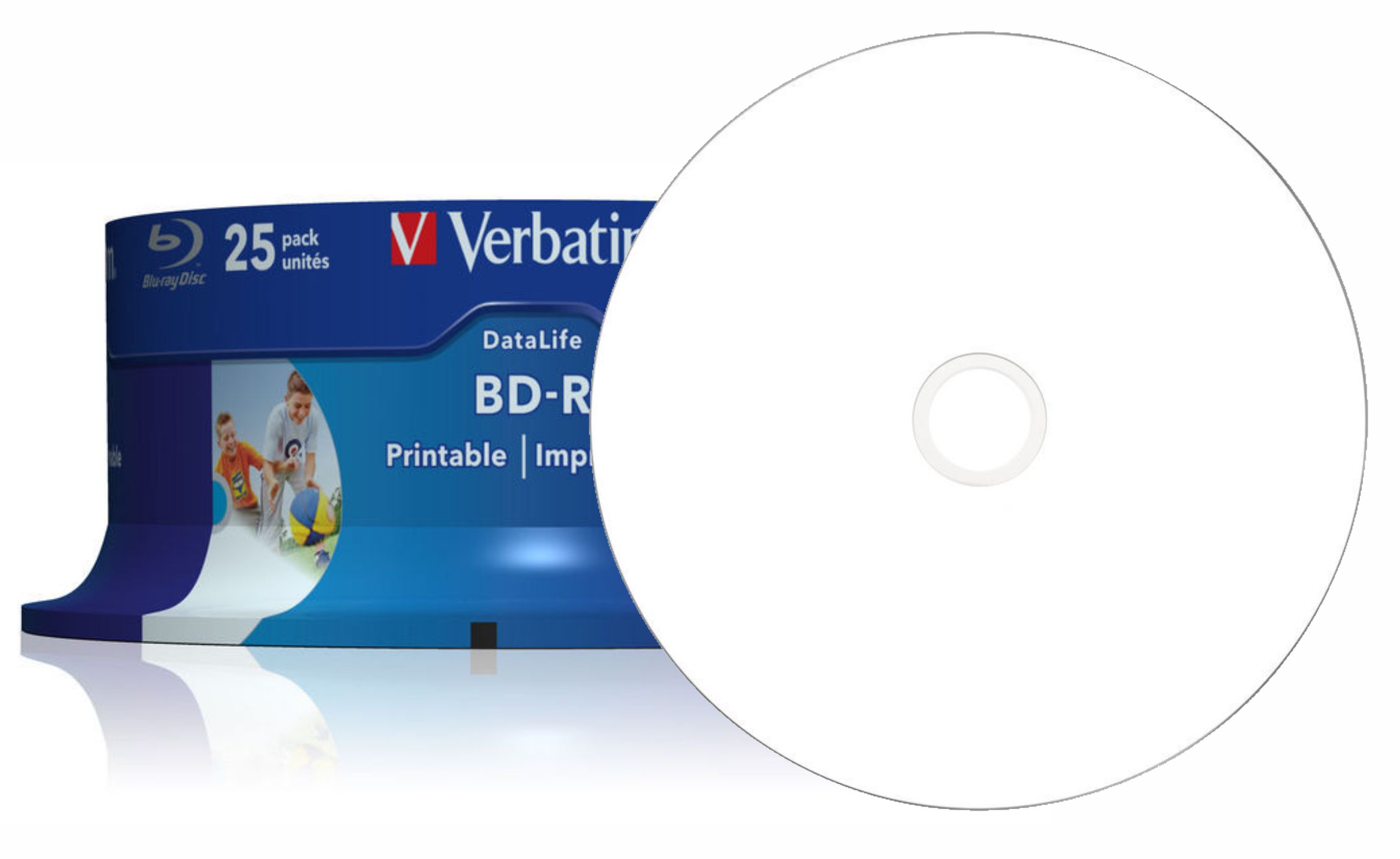 25 носителей Verbatim BLU-RAY емкостью 25 ГБ и скоростью записи до 6x, в упаковке для торта, подходит для печати на струйном принтере.