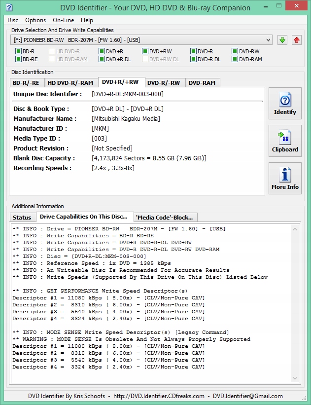 Носитель тестировался на чтение и запись на профессиональных Teac DV-W5000S JVC Archival Drive (~$3000) и Pioneer BDR-PR1, а также на самых высоких версиях Pioneer BDR-S11JX и LiteOn iHAS124 A,B,C,D, E, F\iHAS 224B\iHAS 524B\iHAS 624B, Teac DV-W524GSB, Pioneer DVR-109\110\111\112\115\116\117\212\215\216\217.\Plextor PX-810SA.