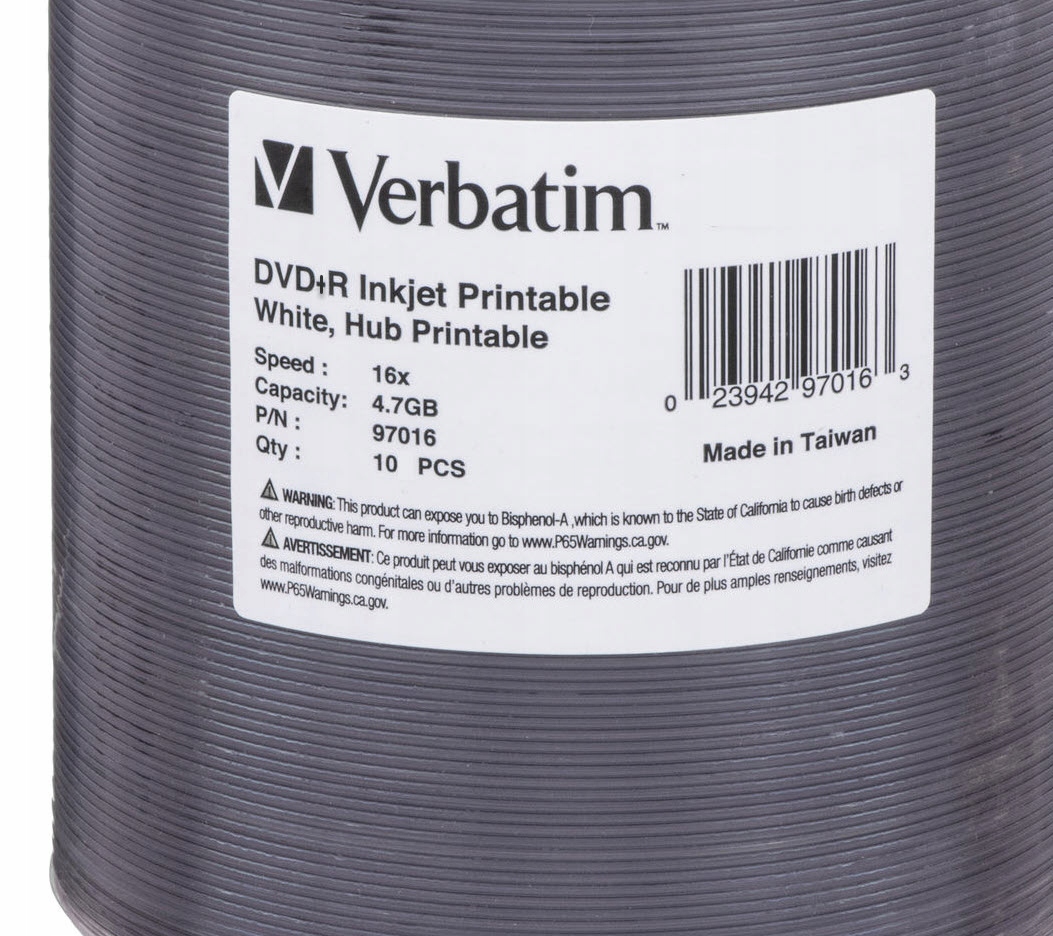 Verbatim DVD+R Printable x16, 25 шт. Конверт для компакт-диска - носитель, перепакованный из упаковки со шпинделями на 100 шт.. Носитель был протестирован на чтение и запись на профессиональном приводе Teac DV-W5000S JVC Archival Drive (~$3000), Pioneer BDR-PR1 и еще нескольких случайных приводах. На фотографиях и скриншотах из диагностических программ представлен предлагаемый носитель.