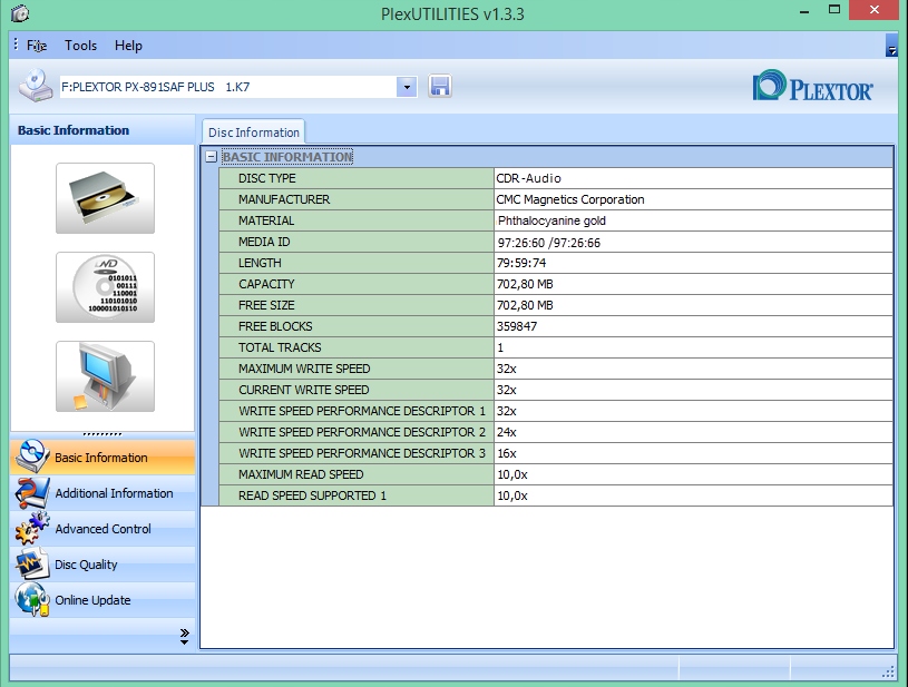 Диск идеально подходит для записи AudioCD на рекордерах YamahaPlextor Premium 2 в режиме Audio Master Quality Recording или Advanced Audio Master Quality Recording
