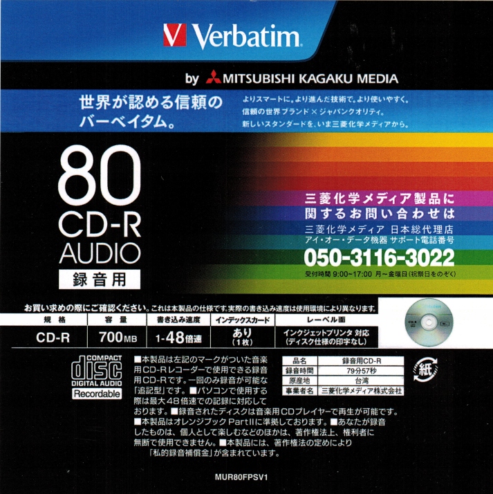 Логотип-производительVerbatim Music logo CD-R Audio.- CMC Magnetic DA: -ATIP- MID: 97m26s60f\97m26s66f (идентификатор производителя) — класс качества A+.
