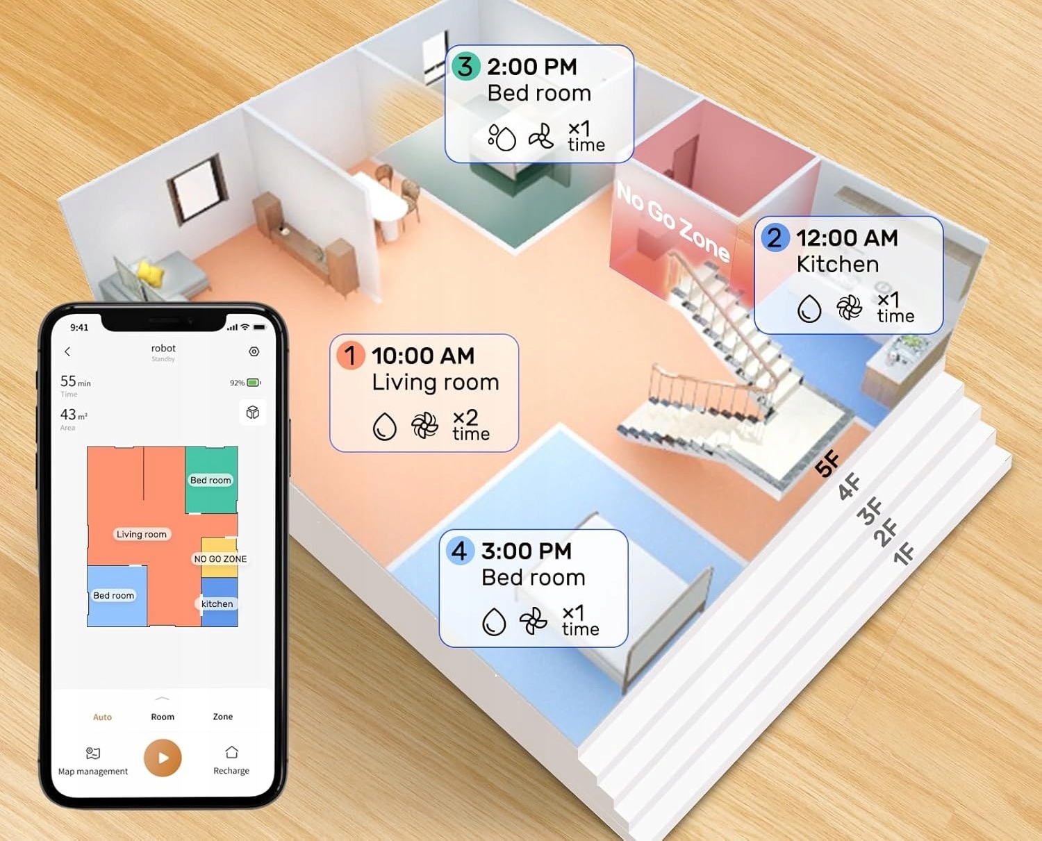 - Intellent LDS 360 ° - тщательное отображение и избегание препятствий, с возможностью записи до 5 карт и конфигурации до 15 запрещенных зон.