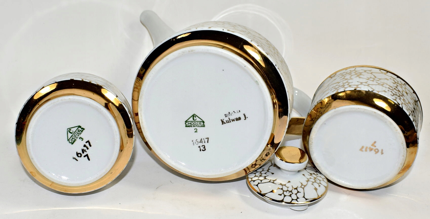 Изделие выполнено из фарфора, покрыто белой глазурью, позолочено - декор в виде тампонажа - подпись декоратораТакже присутствует Кулвас Ежи на подписи.