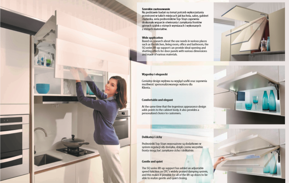 Преимуществом этих систем является плавная и бережная работа, а также возможность остановки любого типа фасадов, даже относительно тяжелых, в любом открытом положении. Механизмы такого типа гарантируют, что фасады открытых шкафов не только не мешают работать на кухне, но и не сталкиваются с другими шкафами. Дополнительным преимуществом является механизм, позволяющий держать шкаф открытым столько времени, сколько вы захотите, при этом исключается риск удариться головой о край двери.