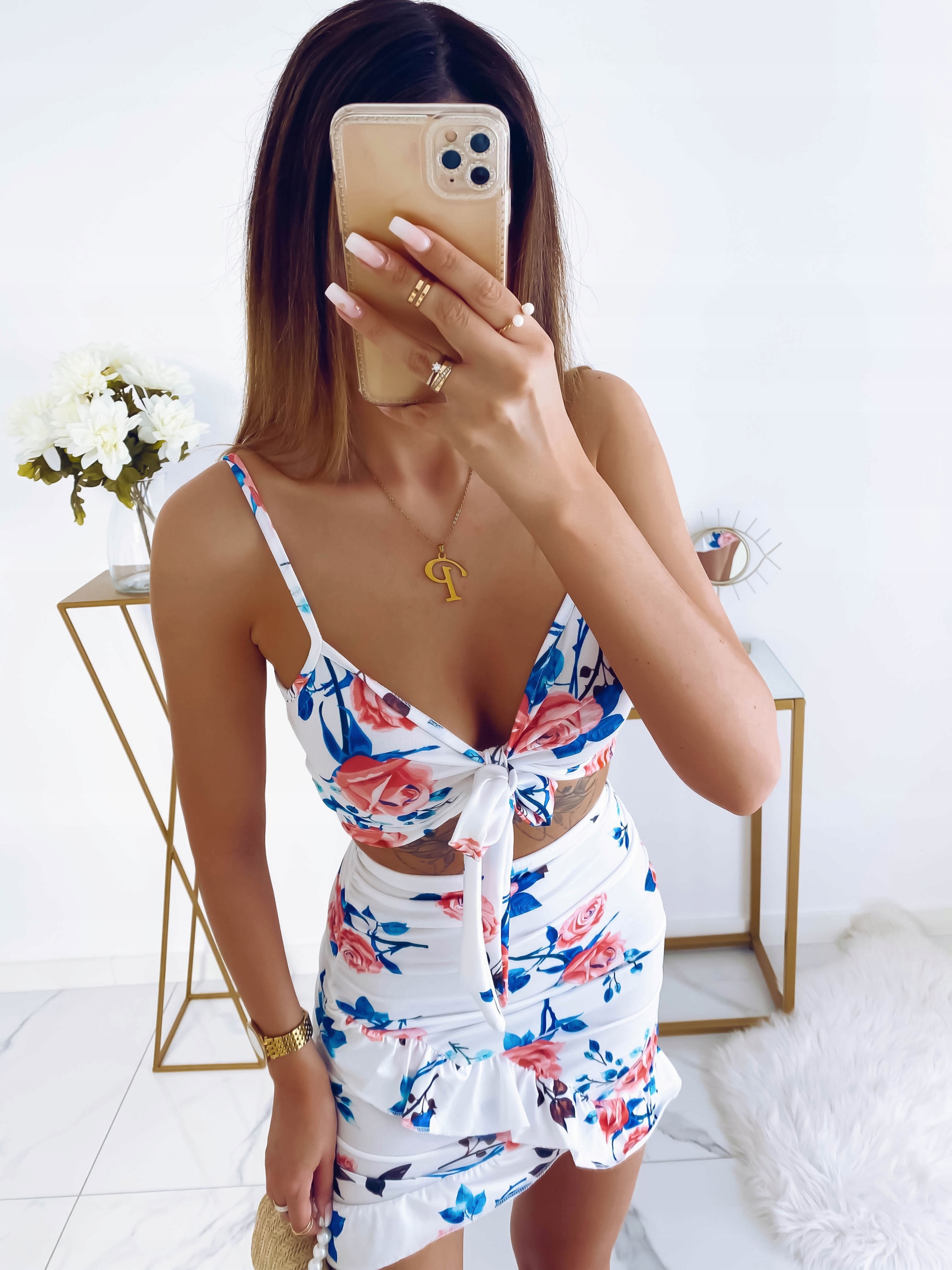 Познакомьтесь с нашей НОВИНКОЙ! Наш комплект – идеальное предложение для теплых дней. Он подойдет как для повседневного стиля, так и для более элегантных случаев. Изготовлен из нежного материала, он обеспечит комфорт при ношении. Топ на бретелях с декоративной завязкой подчеркнет вырез. Мини-юбка-карандаш с рюшами стройнит ноги. Самый модный в этом сезоне цветочный узор комплекта придаст дополнительный характер всему образу. Выберите свой идеальный узор и создайте стиль с нашей моделью.