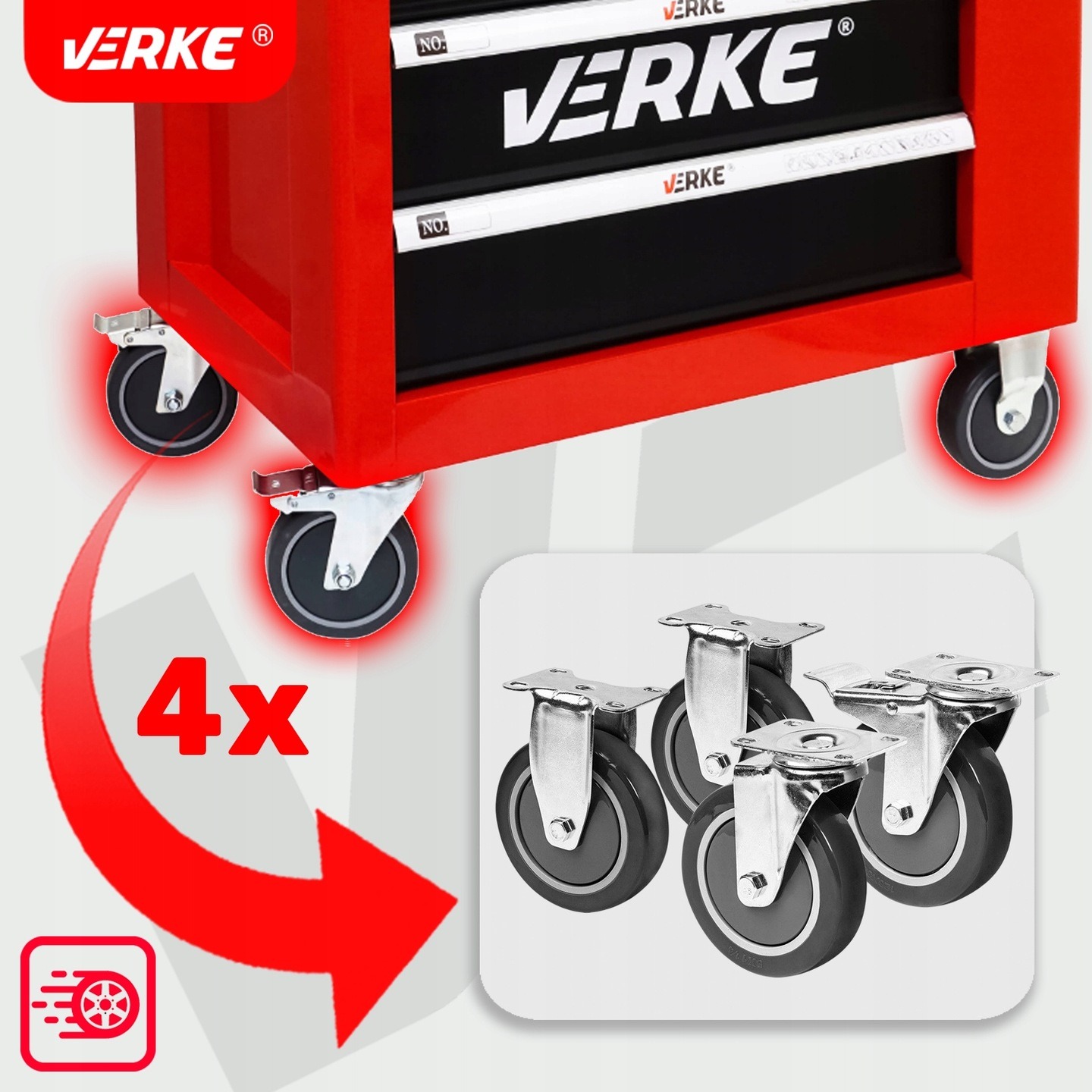 Шкаф для инструментов Verke имеет 7 практичных ящиков для инструментов и боковой шкаф, закрывающийся на центральный замок. Все ящики полностью открываются и имеют шариковые направляющие, что обеспечивает длительную, плавную и надежную работу. Ящики фиксируются замком-защелкой, что обеспечивает защиту окружающей среды во время транспортировки. Поверхность столешницы устойчива к маслам и жирам. Пятидюймовые, бесшумные, поворотные колеса облегчают маневрирование шкафа и оснащены тормозом. Шкаф оснащен ручкой, облегчающей переноску.