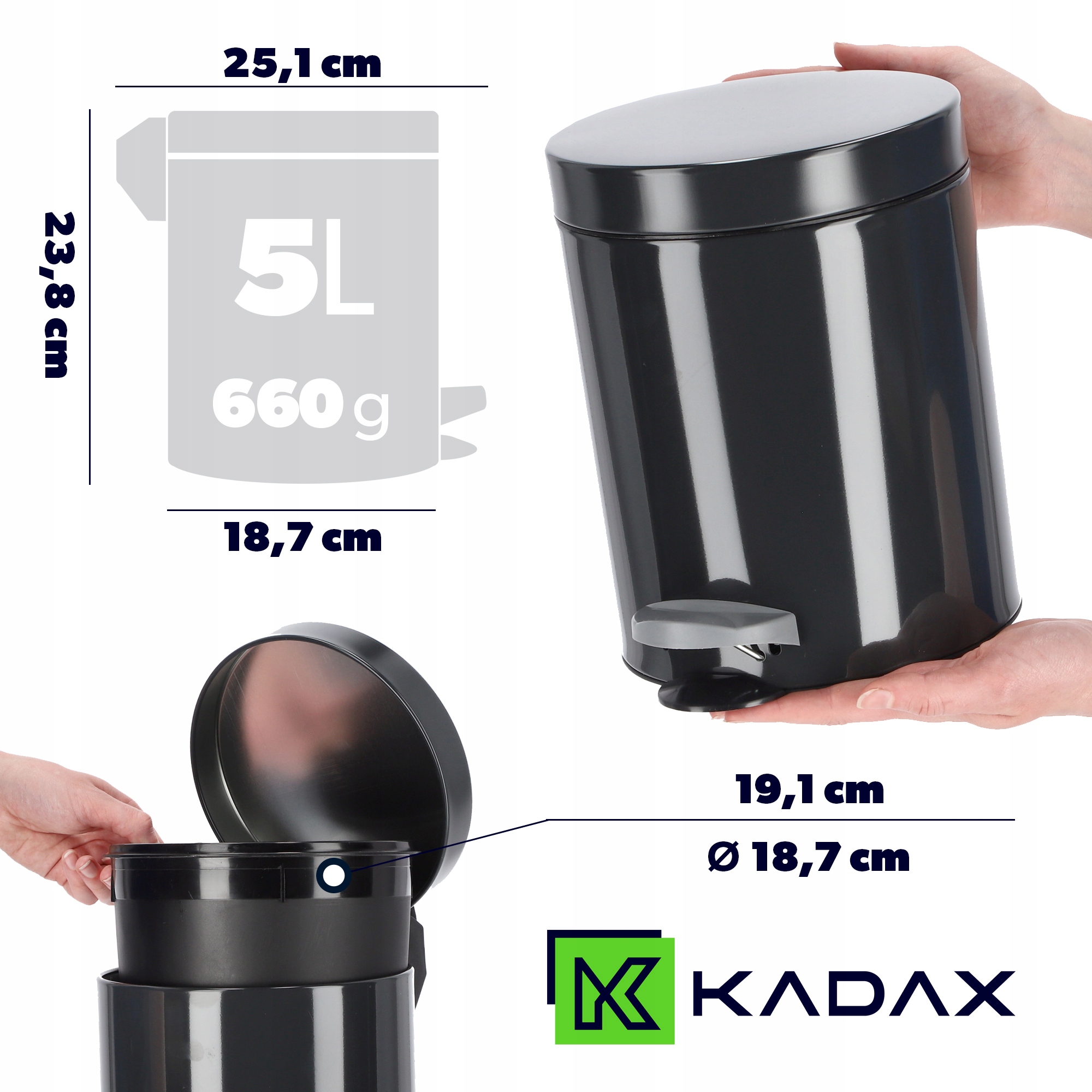 ✅РАЗЛИЧНЫЕ ВИДЫ - в нашем предложении есть стальные контейнеры для мусора двух цветов: антрацит и белый. Вы также можете выбрать их мощность. Мы предлагаем Корзину 5 л размерами 25,1 х 18,7 х 23,8 см и Корзину 14 л размерами 32,9 х 24,9 х 39,5 см.