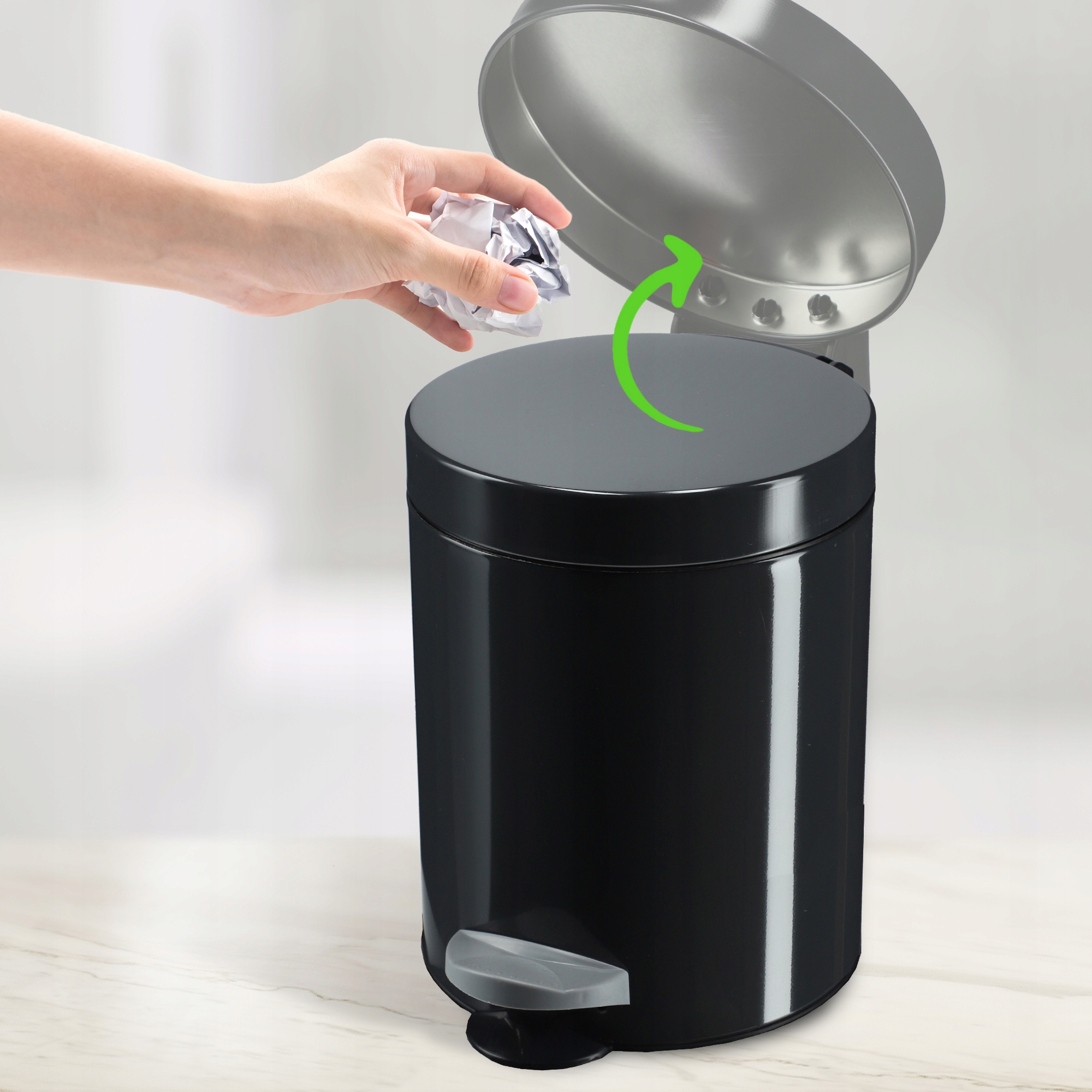 ✅С ПЕДАЛИ - изделие имеет был разработан для обеспечения удобного открытия. Внизу корзины находится педаль, которая автоматически поднимает крышку. Для этого не обязательно использовать руки.