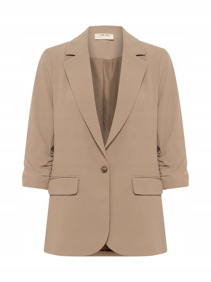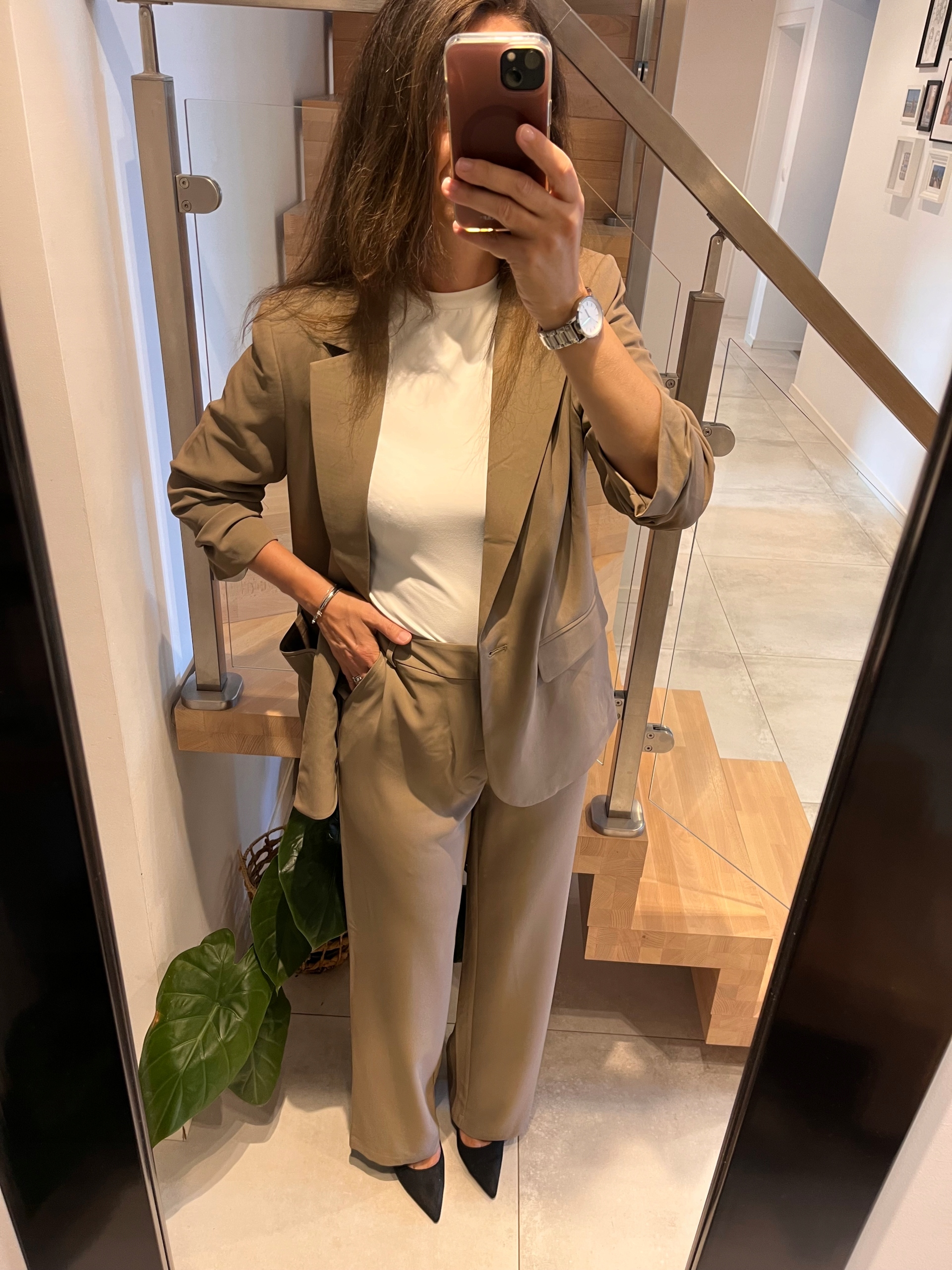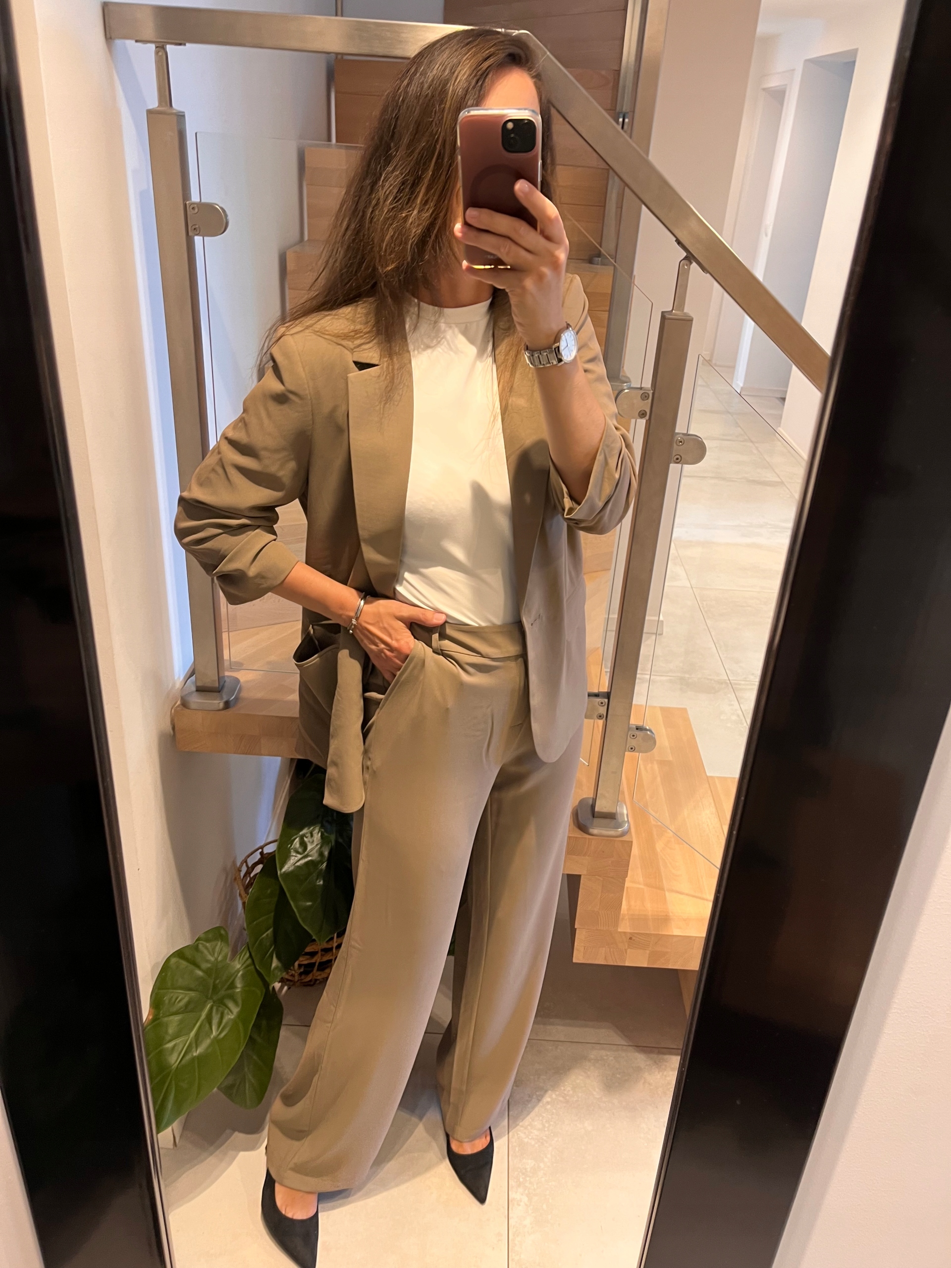 Отличный, модный костюм датского бренда крем с приятной, эффективной тканью в хорошем оттенке коричневого - кофе с молоком. Очень красиво адаптированная куртка, закрепленная спереди с одной кнопкой, с 3/4 рукавами, интересно замороженными, с красивыми клапанами и нежными подушками на плечах, с подкладкой внизу. Элегантные брюки с немного более широкой, более свободной ногой, в талии, традиционно закрепленные молнией, дополнительно с резиновой лентой. Всего вместе очень тонкие, также отличные также изношенные отдельно в различных конфигурациях. Модный и стильный.