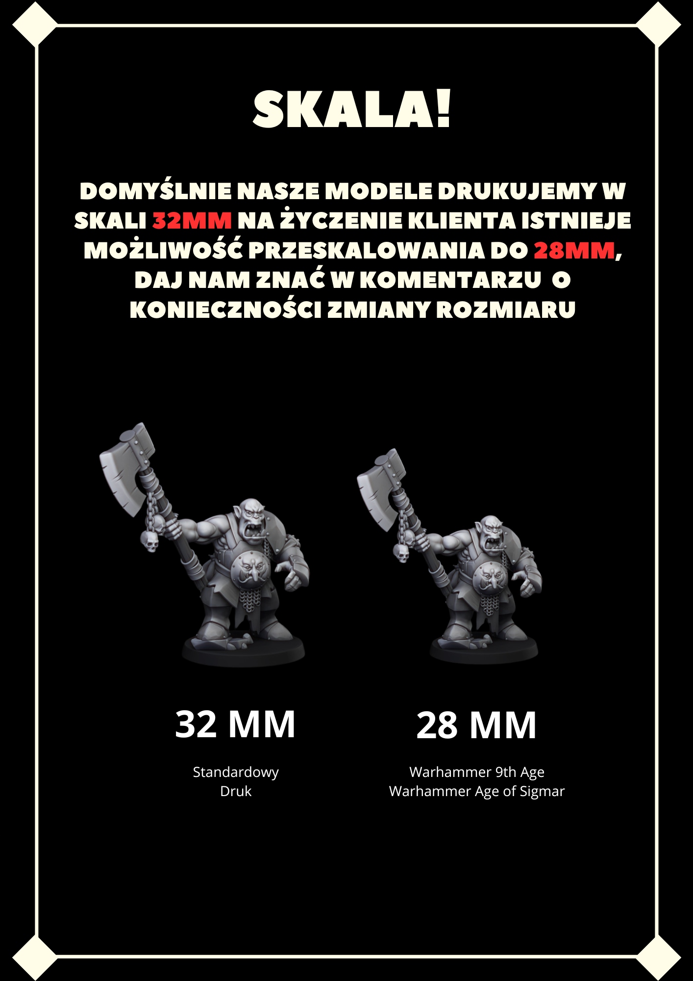Эти модели являются идеальной альтернативой армейским фигуркам Королевства Огров в различных боевых системах. Фигурка выполнена в стандарте 32 мм. Можно масштабировать до 28 мм