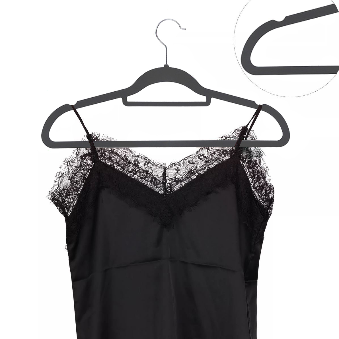 Благодаря профилированным вмешательствам на вешалке вы повесите всю одежду с тонкими ремнями, не опасаясь, что они упадут.