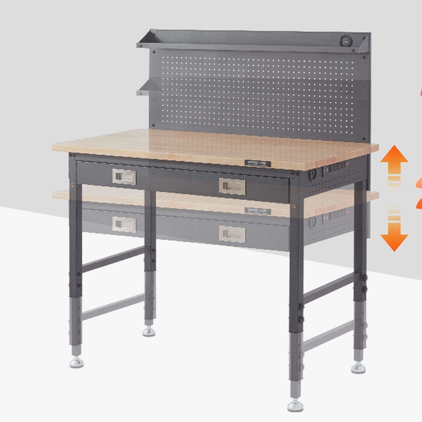 ⭐️ Регулируемый верстак из массива дерева и стали — столешница из дуба, грузоподъемность 907 кг, встроенное светодиодное освещение, панель питания с USB и розетками, доска для инструментов с крючками — для гаража и мастерской ⭐️