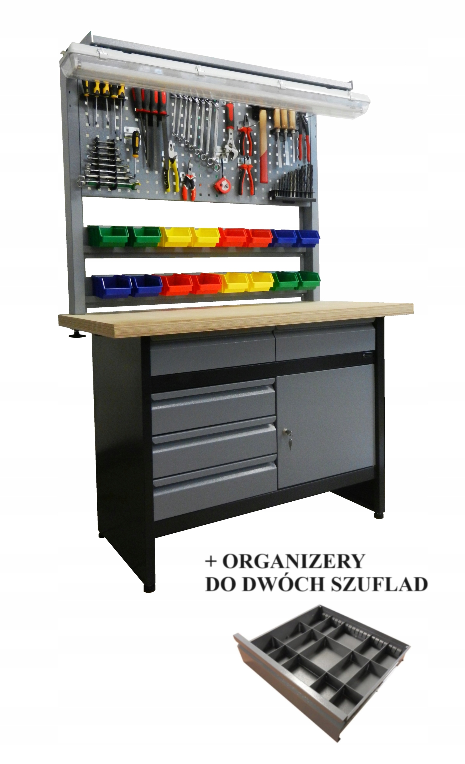 - оснащен перфорированной стенкой (квадратная перфорация) и двумя кронштейнами для подвешивания контейнеров для мелких элементов, каждый кронштейн имеет 8 слотов для контейнеров.