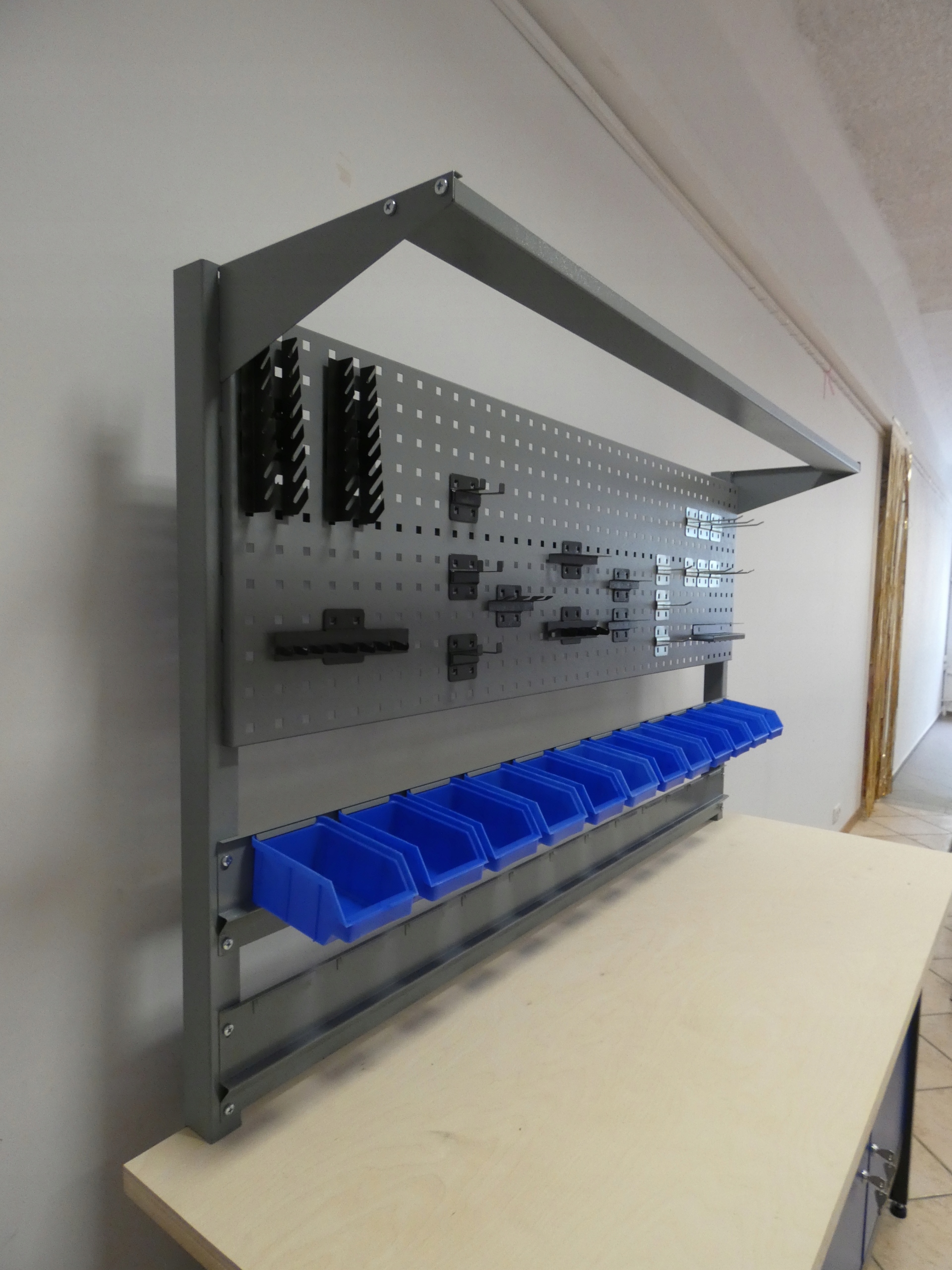 - оснащается перфорированной стенкой (квадратная перфорация) и двумя кронштейнами. для подвешивания контейнеров для мелких элементов, каждый кронштейн имеет 12 прорезей для контейнеров, всего 24 места.