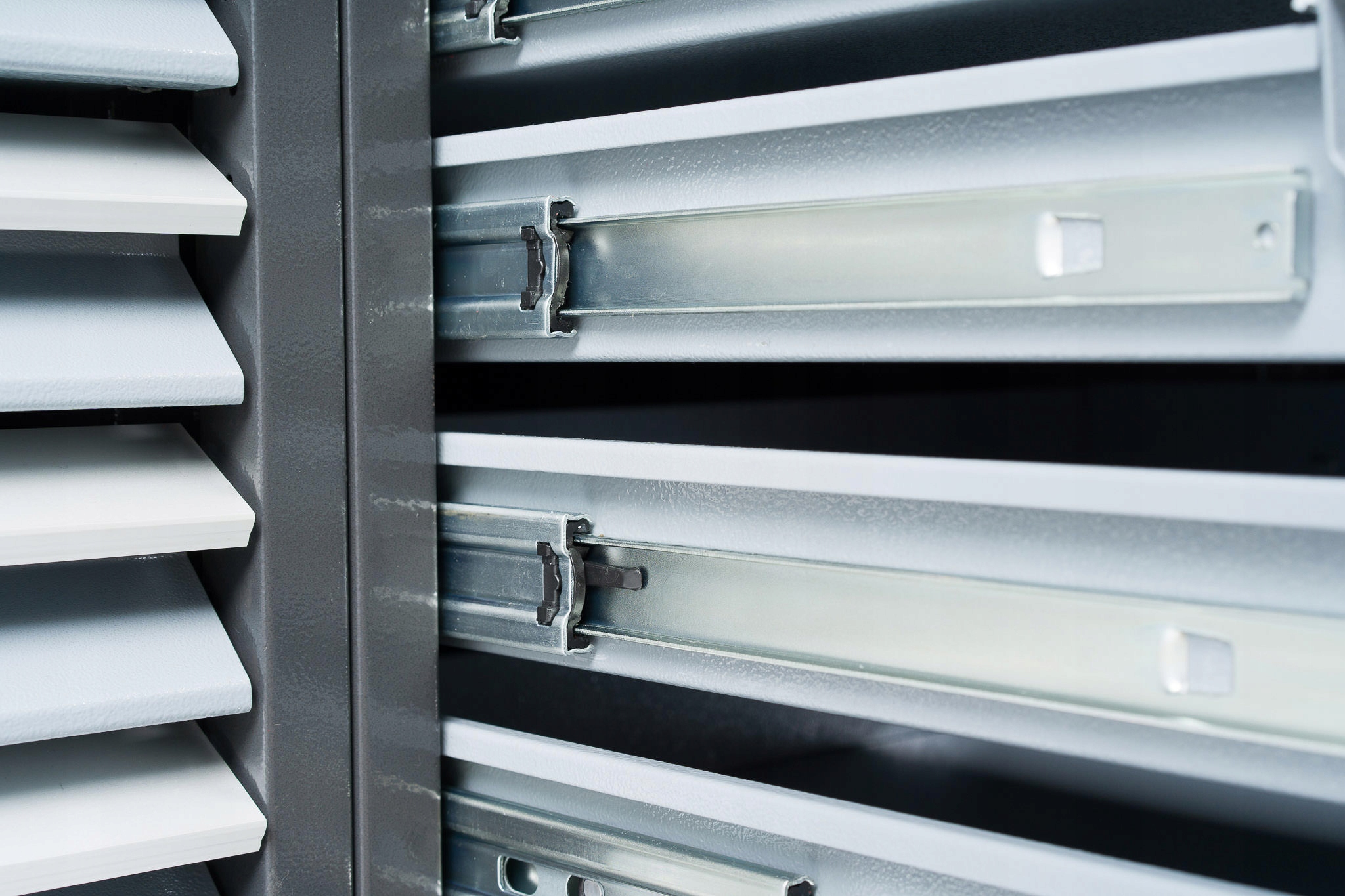 - перфорированная задняя стенка, позволяющая подвешивать держатели для инструментов - КВАДРАТНАЯ ПЕРФОРАЦИЯ