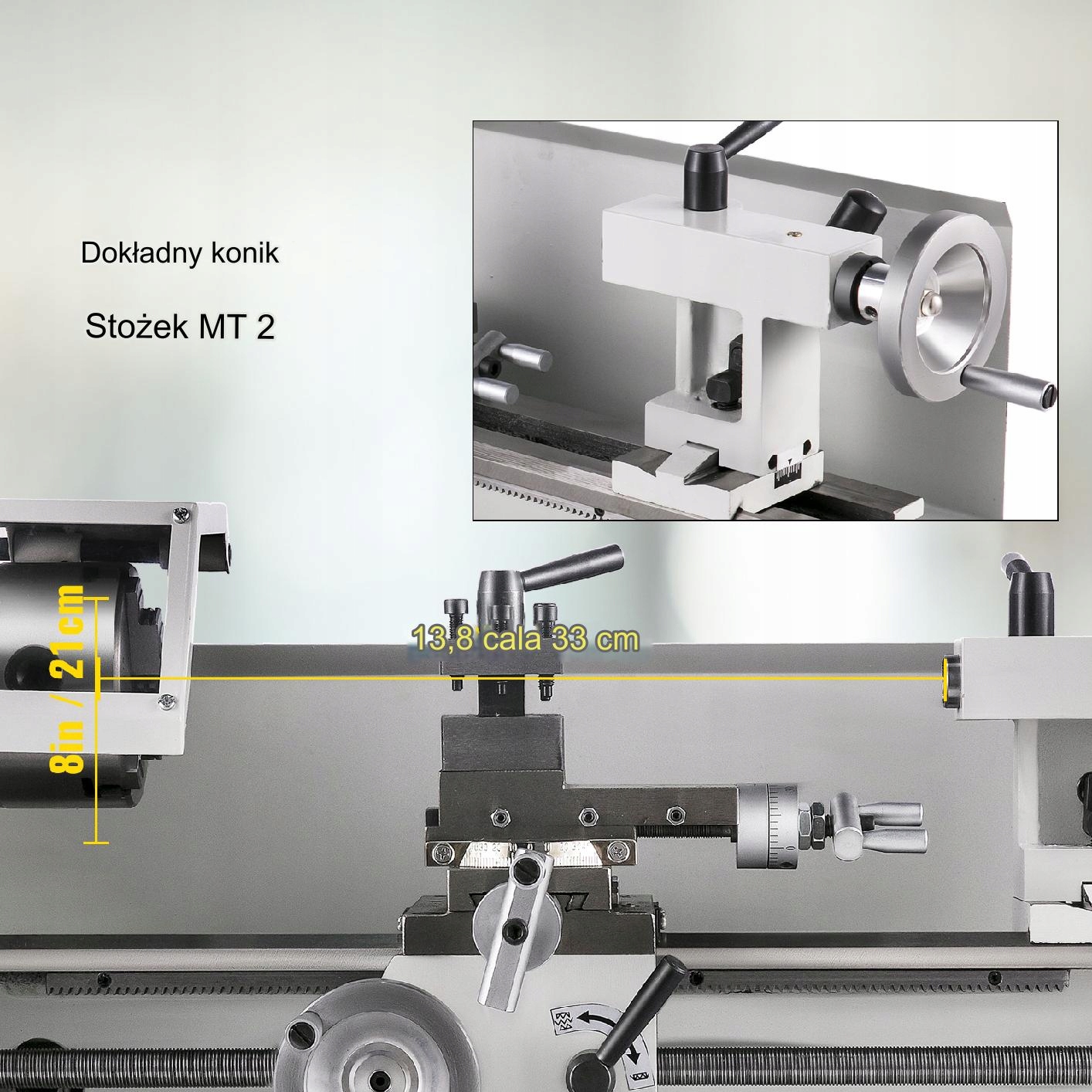Перемещение: 8,3 дюйма/210 мм, перемещение поперечных суппортов: 13,8 дюйма/350 мм, диаметр трехкулачкового патрона: 3,9 дюйма/100 мм. Токарный станок оснащен ножка, поддерживающая продольную ось вращения заготовки.