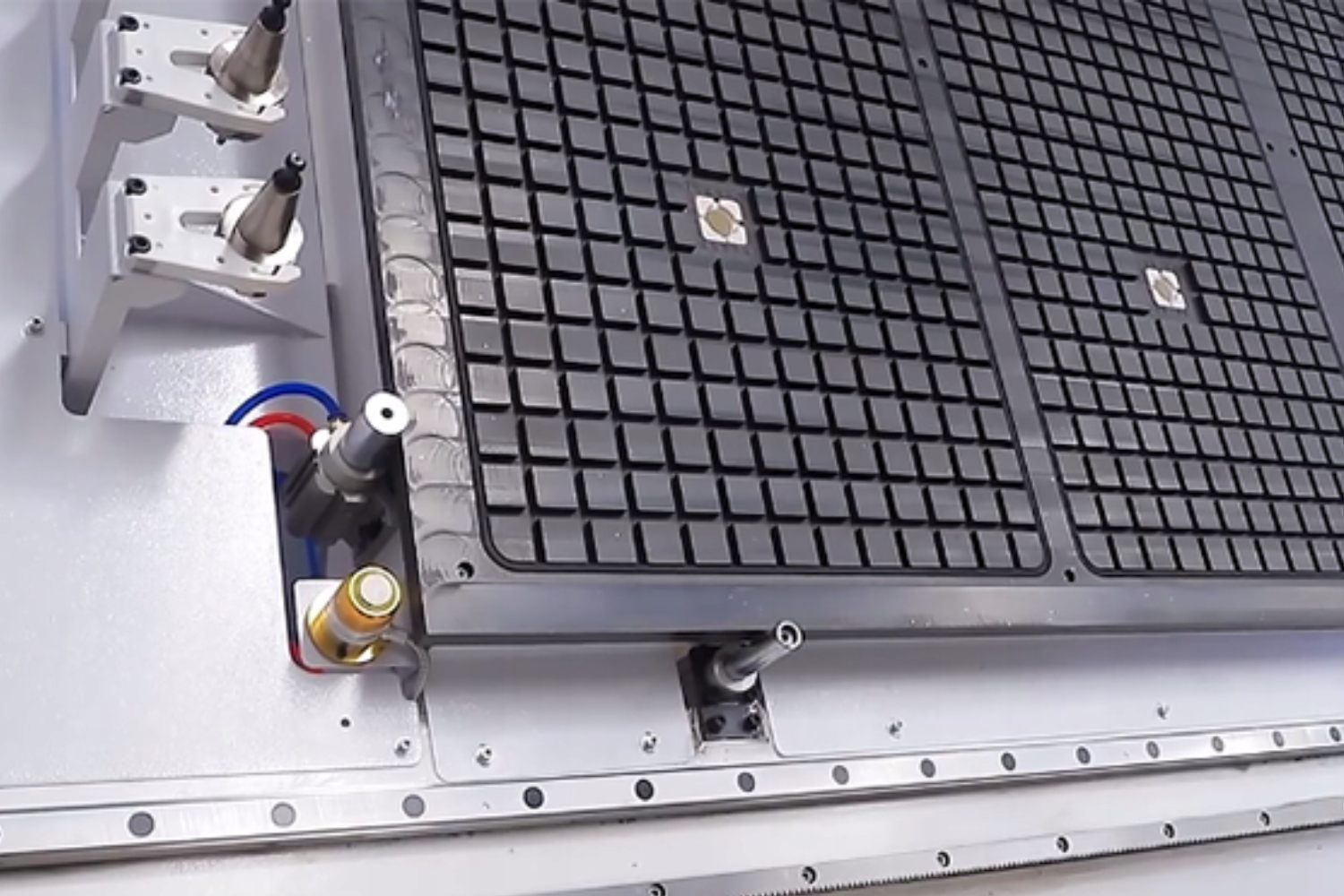 Таблица машины оснащена пневматическими позиционерами, запущенными с уровня оператора , определяя постоянную базовую точку рабочей столешницы, машина сделана в гибридной технологии - имеет вакуумные секции и подмножества Automatic, неразрыв и также Slots Slots slots slots slots slots. ручное крепление. Рабочая таблица имеет четыре независимых вакуумных рабочих зон . Машина оснащена линейным автоматическим журналом для инструментов 12-позиций . Все слоты для инструментов заполнены ручками iso30 . Диск предоставляется четырьмя полными услугами Headshine с 1500W , включая двойной на y.