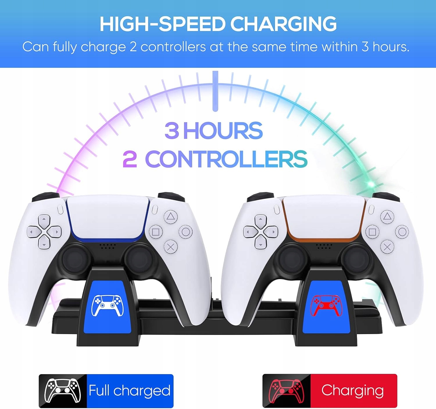 ЗАРЯДНАЯ СТАНЦИЯ С ДВОЙНЫМ КОНТРОЛЛЕРОМ СО СВЕТОДИОДНЫМ ИНДИКАТОРОМ. Зарядные устройства с двойными контроллерами высокой мощности ускоряют зарядку и сокращают время зарядки. Благодаря индикатору зарядки легко определить состояние зарядки, подходит для беспроводных контроллеров PS5.